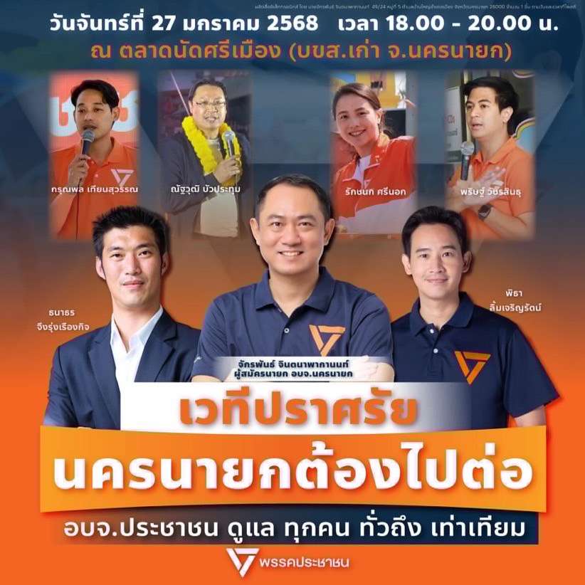 ทั้งนี้ นายพิธา และนายธนาธร มีกำหนดการไปขึ้นเวทีปราศรัยใหญ่เพื่อช่วยหาเสียงให้กับ “จิม” จักรพันธ์ จินตนาพากานนท์ ผู้สมัครนายก อบจ.นครนายก เบอร์ 2 พรรคประชาชน และส.อบจ.พรรคประชาชน วันจันทร์ที่ 27 มกราคม 2568 ตั้งแต่เวลา 18.00 น.เป็นต้นไป ที่ตลาดนัดศรีเมือง (บขส.เก่า จ.นครนายก) โดยมีทีมช่วยหาเสียงระดับแม่เหล็กจากพรรคประชาชน อาทิ “ไอติม” พริษฐ์ วัชรสินธุ โฆษกพรรค, “เพชร” กรุณพล เทียนสุวรรณ, คุณณัฐวุฒิ บัวประทุม และ “ไอซ์” รัชนก ศรีนอก