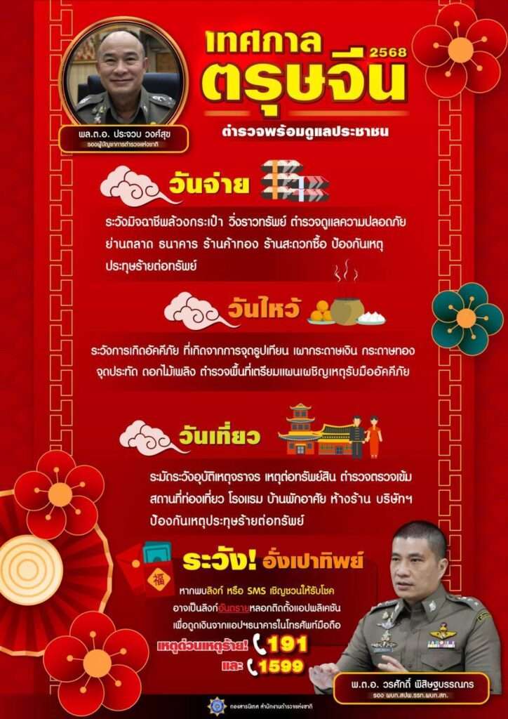 สำนักงานตำรวจแห่งชาติ เตรียมพร้อมมาตรการเข้มดูแลประชาชนช่วงเทศกาลตรุษจีน 2568 ทั้งวันจ่าย วันไหว้ วันเที่ยว แนะประชาชนระมัดระวังป้องกันอัคคีภัย และระวังภัยออนไลน์ “อั่งเปาทิพย์”