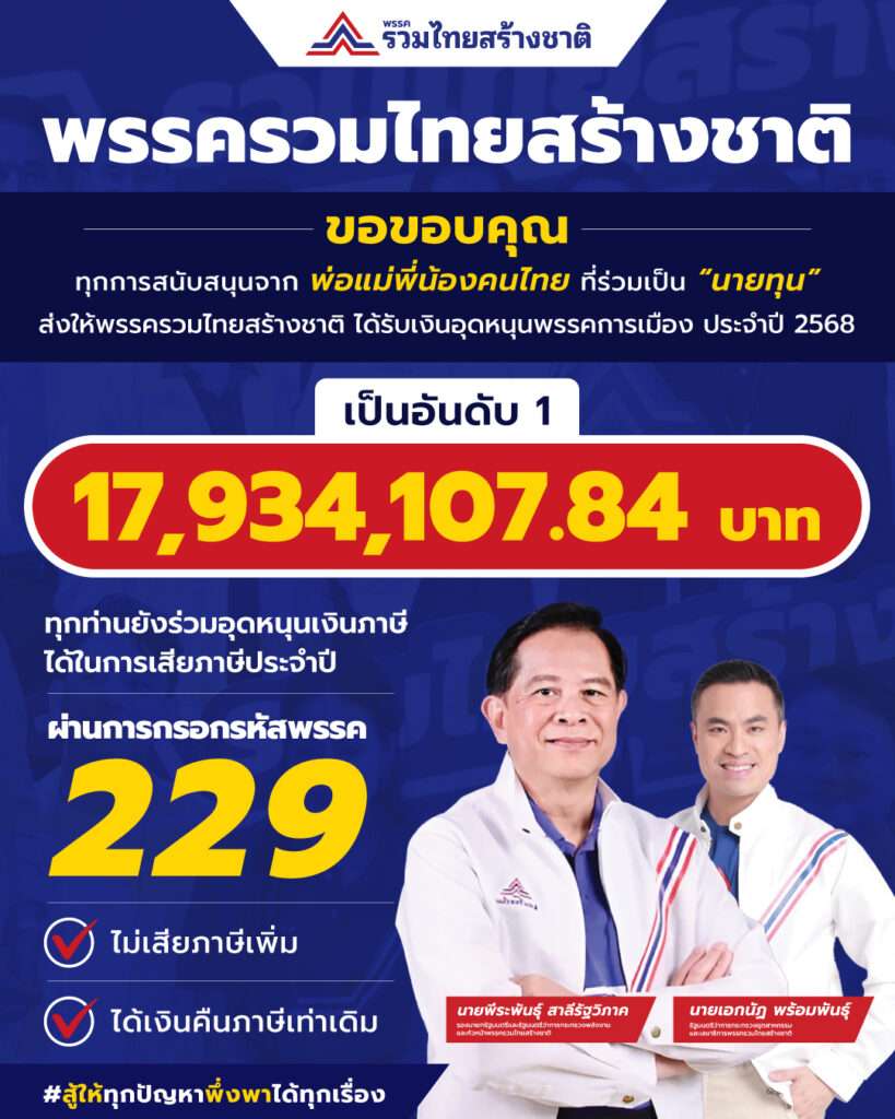พรรครวมไทยสร้างชาติ (รทสช.) วันที่ 26 มกราคม 2568 นายเอกนัฏ พร้อมพันธุ์ เลขาธิการพรรค ในฐานะรัฐมนตรีว่าการกระทรวงอุตสาหกรรม กล่าวขอบประชาชนและสมาชิกพรรครวมไทยสร้างชาติทุกคน ที่ได้ร่วมสนับสนุน ร่วมให้กำลังใจ และร่วมยืนหยัดเคียงข้างกับพรรค จนทำให้ได้รับเงินอุดหนุนจากกองทุนเพื่อการพัฒนาพรรคการเมือง มาเป็นอันดับ 1 ด้วยจำนวนเงินกว่า 17,934,107.84 บาท  ทั้งพรรคยังมีคะแนนนิยมเพิ่มขึ้นต่อเนื่องอย่างเห็นได้ชัด ขอขอบคุณทุกกำลังใจที่ส่งมาให้ในทุกช่องทาง ซึ่งตนได้อ่านทุกข้อความ และขอยืนยันว่าจะมุ่งมั่นเดินหน้าทำงานอย่างต่อเนื่อง เพื่อพัฒนาประเทศชาติและเพื่อประโยชน์ของคนไทยทุกคน โดยในกระทรวงอุตสาหกรรม ตนมีทีมการเมืองที่หนักแน่นเข้มแข็ง และมีข้าราชการประจำที่ช่วยกันขับเคลื่อนงานตามนโยบาย “รื้อ ลด ปลด สร้าง” อย่างมุ่งมั่น