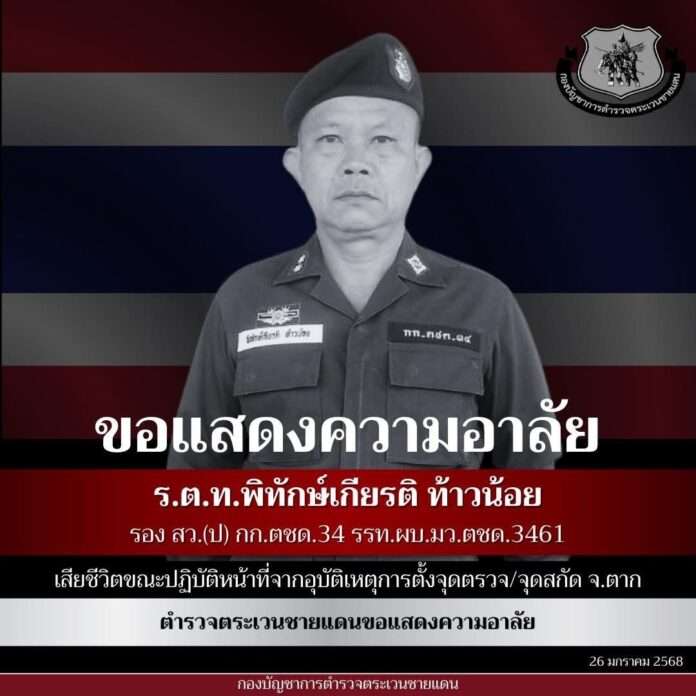 ผบช.ตชด. ขอแสดงความอาลัยต่อครอบครัว ร.ต.อ.พิทักษ์เกียรติ ยกย่อง “ตชด.ผู้กล้า” รถพ่วงพุ่งชนขณะตั้งจุดคัดกรองสกัดอาชญากรรมพิทักษ์แนวชายแดน จว.ตาก สั่งจัดพิธีศพสมเกียรติ “ผู้พิทักษ์สันติราษฎร์” เผยด่านตรวจทำตามยุทธวิธี ศึกษาบทเรียนป้องกันซ้ำรอย