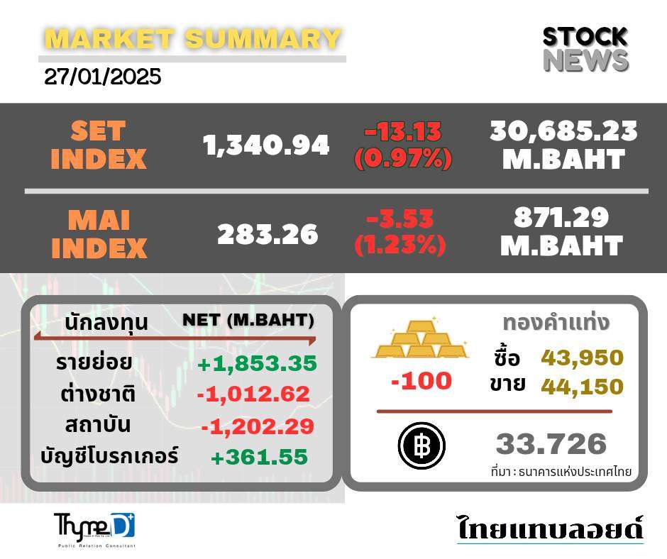 SET ปิดวันนี้ที่ 1,340.94 จุด ลดลง 13.13 จุด (-0.97%) มูลค่าซื้อขาย 30,721.68 ล้านบาท