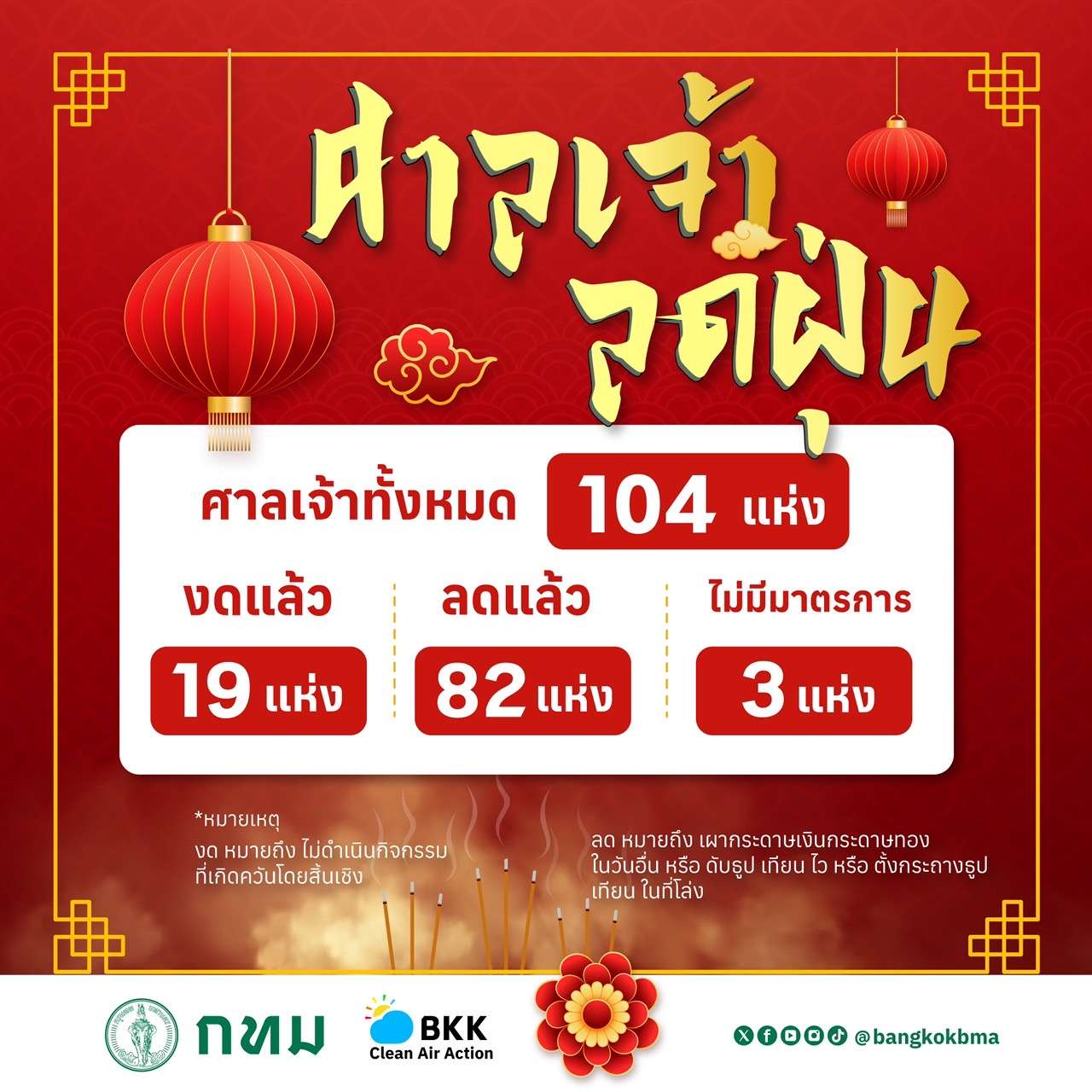 กทม. ชวนประชาชนร่วมลดฝุ่นวันตรุษจีน “ลด” “งด” จุดธูป เผากระดาษเงินทอง ศาลเจ้าในกรุงเทพฯ ขานรับนโยบาย “ศาลเจ้าลดฝุ่น” ด้วยกว่า 100 แห่ง