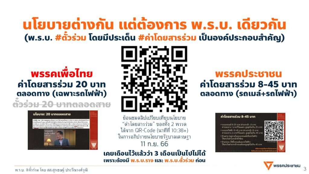 พ.ร.บ.ตั๋วร่วมฯ มีประเด็นสำคัญคือค่าโดยสารร่วม และเรื่องนี้ตนเคยเตือนแล้วว่าที่พรรคเพื่อไทยหาเสียงไว้ว่า 20 บาทตลอดสายภายใน 3 เดือนเป็นไปไม่ได้ ต้องมี พ.ร.บ.รางฯ และ พ.ร.บ.ตั๋วร่วมฯ วันนี้มีการเสนอ พ.ร.บ.ตั๋วร่วมแล้วก็ถือว่าเป็นเรื่องที่ดีสำหรับการต่อยอดนโยบายไม่ว่าจะจากพรรคเพื่อไทยหรือพรรคประชาชน ประเด็นจากนี้คือจะเขียน พ.ร.บ. อย่างไรให้ครอบคลุมเป็นกฎหมายสำคัญสำหรับประเทศนี้ ไม่ว่านโยบายรัฐบาลจะเปลี่ยนไปอย่างไร