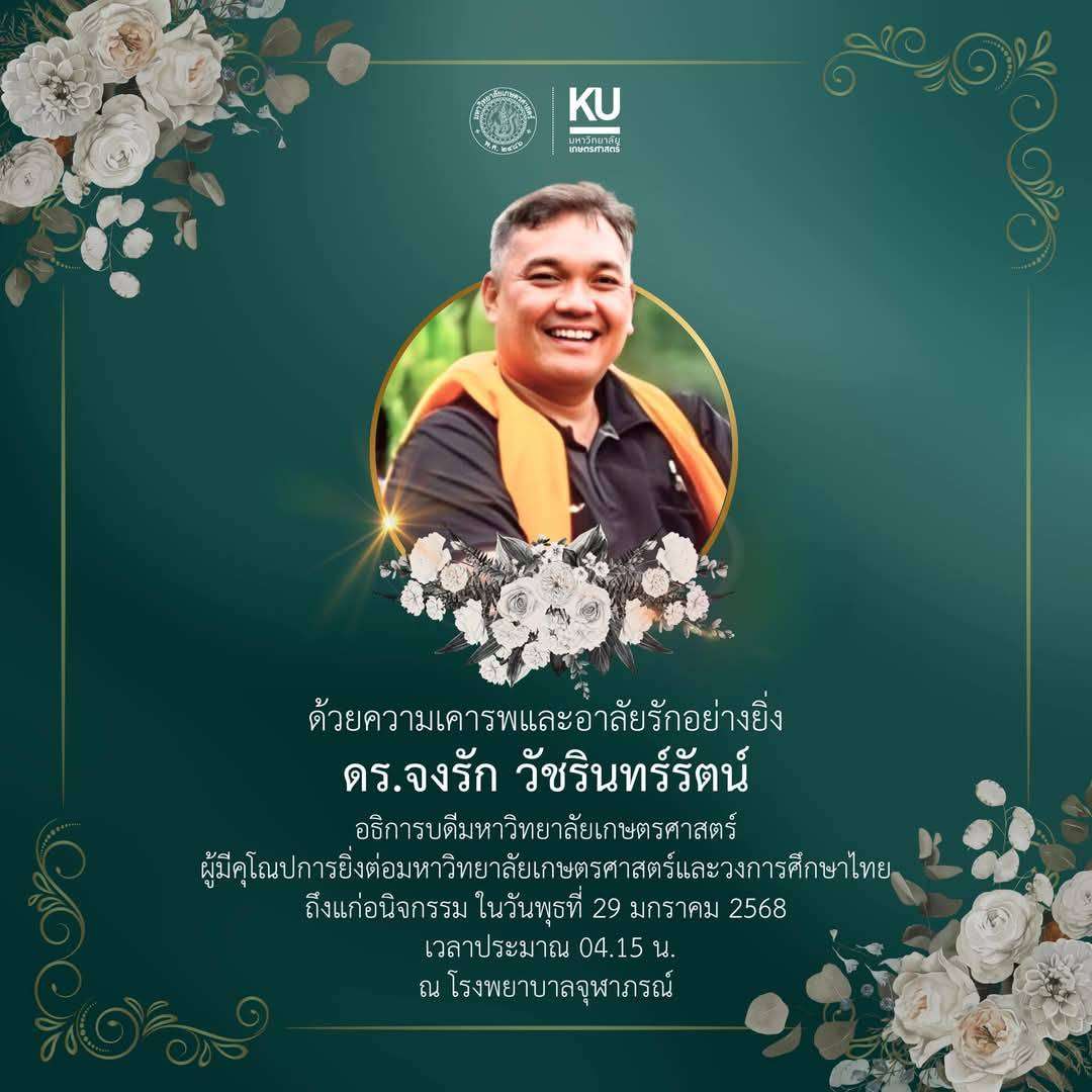 เมื่อวันที่ 29 มกราคม 2568 มีรายงานว่า ดร.จงรัก วัชรินทร์รัตน์ อธิการบดีมหาวิทยาลัยเกษตรศาสตร์ ถึงแก่อนิจกรรมด้วยอาการสงบ เมื่อช่วงเช้าตรู่ของวันนี้ ที่โรงพยาบาลจุฬาภรณ์ โดยโลกโซเชียลมีการโพสต์ข้อความแสดงความอาลัยต่อการจากไปของท่านอธิการบดี ที่ทำคุณประโยชน์ให้กับวงการการศึกษา และวงการเกษตรไทยไว้มากมาย