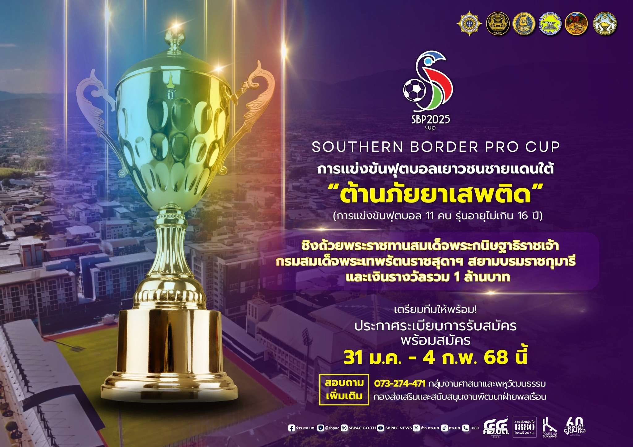 ที่ ศูนย์อำนวยการบริหารจังหวัดชายแดนภาคใต้ (ศอ.บต.) วันที่ 31 ม.ค. เพื่อเป็นการสนับสนุนให้เยาวชนใช้เวลาว่างด้วยการออกกำลังกาย ห่างไกลยาเสพติด รวมทั้งยังปูทางไปสู่การเป็นนักฟุตบอลอาชีพในอนาคต พ.ต.ท.วรรณพงษ์ คชรักษ์ เลขาธิการ ศอ.บต.จึงร่วมกับสำนักงานคณะกรรมการป้องกันและปราบปรามยาเสพติด กองทุนป้องกันปราบปรามและแก้ไขปัญหายาเสพติด และจังหวัดชายแดนภาคใต้ จัดกิจกรรม การแข่งขันฟุตบอลเยาวชนชายแดนใต้ ต้านภัยยาเสพติด Southern border pro cup (SBP CUP) ชิงถ้วยพระราชทานสมเด็จพระกนิษฐาธิราชเจ้า กรมสมเด็จพระเทพรัตนราชสุดา ฯ สยามบรมราชกุมารี พร้อมเงินรางวัลรวม 1 ล้านบาท โดยเปิดรับสมัครทีมฟุตบอลเยาวชนรุ่นอายุไม่เกิน 16 ปี (เกิด พ.ศ. 2552 เป็นต้นไป) เข้าร่วม ซึ่งทีมที่สนใจสามารถดาวน์โหลดใบสมัครได้ทางเว็บไซต์ ศอ.บต. และเพจข่าว ศอ.บต. และส่งใบสมัครตัวจริงพร้อมหลักฐาน ณ อาคาร ศอ.บต. ตั้งแต่วันวันนี้ จนถึงวันที่ 4 กุมภาพันธ์ 2568