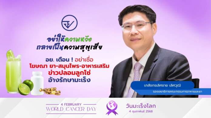 4 กุมภาพันธ์ วันมะเร็งโลก อย. เตือนประชาชนอย่าหลงเชื่อโฆษณาหรือข่าวปลอมอ้างรักษามะเร็งหายขาดได้ ย้ำ ควรปรึกษาแพทย์ผู้เชี่ยวชาญเท่านั้น แนะ ตรวจสอบข้อมูลจากแหล่งน่าเชื่อถือก่อนซื้อผลิตภัณฑ์ทุกครั้ง
