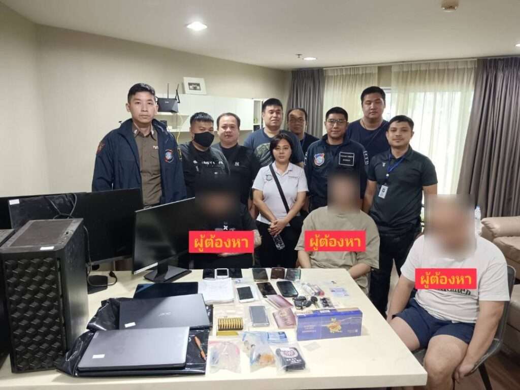 วันนี้ (4 ก.พ.) พล.ต.ท.ศักดิ์ศิรา เผือกอ่ำ ผบช.ทท. พร้อมด้วย พล.ต.ต.นรเศรษฐ์ สุวรรณนิกขะ ผบก.ทท.1 พ.ต.อ.ปิยรัช สุภารัตน์ รอง ผบก.ทท.1 พ.ต.อ.กรฤวิศวร์ ทองศรีวาณิช ผกก.1 บก.ทท.1 และ พ.ต.ท.นิมิตร จรรยาลักษณ์ สว.กก.1 บก.ทท.1 นำกำลังฝ่ายสืบสวน กก.1 บก.ทท.1 จับกุมตัว Mr.Wenchong อายุ 41 ปี Mr.Pengcheng อายุ 24 ปี และ Mr.Pohong อายุ 31 ปี ทั้ง 3 รายเป็นผู้ต้องหาสัญชาติจีน พร้อมของกลาง เครื่องคอมพิวเตอร์ จำนวน 5 เครื่อง โทรศัพท์มือถือ 11 เครื่อง ซิมการ์ดโทรศัพท์ 14 ซิม เครื่องสร้างรหัส OTP TOKEN 1 เครื่อง ยาไอซ์ 0.7 กรัม และ เครื่องกระสุนปืน ขนาด 9 มม.อีก 50 นัด โดยจับกุมตัวได้ที่ห้องพักในคอนโดมิเนียมหรู ย่านห้วยขวาง