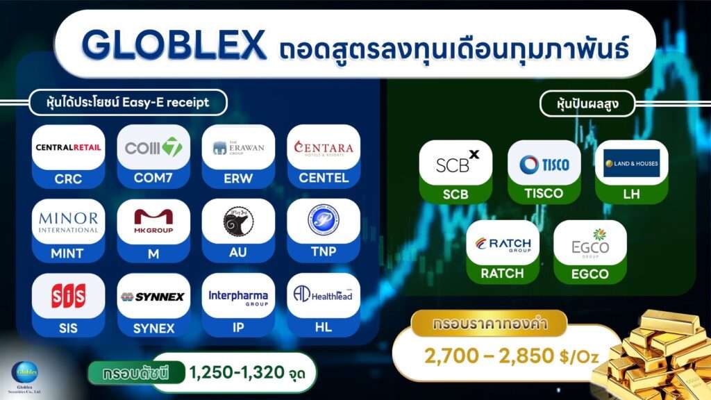 กรุงเทพฯ – บล. โกลเบล็ก (GBS) ประเมินหุ้นไทยเดือน ก.พ. แกว่งตัว Sideway Down จากแรงกดดันนโยบายทรัมป์ ประกาศเก็บภาษีนำเข้าสินค้ากับสหภาพยุโรป (EU) ประกอบกับนักลงทุนเฝ้าติดตามการรายงานผลการดำเนินงานงวดปี 2567 ของบริษัทจดทะเบียน จึงให้กรอบการเคลื่อนไหวของดัชนี 1,250-1,320 จุด แนะกลยุทธ์ลงทุนหุ้น 2 ธีมเด่นได้อานิสงส์ Easy-E receipt-ปันผลสูง
