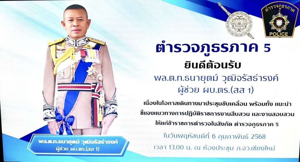 เมื่อวันพฤหัสบดี ที่ 6 ก.พ.68 เวลา 13.00 น. ที่ห้องประชุม ภ.จว.เชียงใหม่ ต.ท่าศาลา อ.เมืองเชียงใหม่ จ.เชียงใหม่ ผู้สื่อข่าวไทยแทบลอยด์ รายงานว่า พล.ต.ท.ธนายุตม์ วุฒิจรัสธำรงค์ ผู้ช่วย ผบ.ตร.(สส) รับผิดชอบกำกับการบริหารราชการ ภ.5 (เฉพาะ บก.สส.) รวมทั้งสั่งและปฏิบัติราชการแทน ผบ.ตร. ในลักษณะงานสืบสวนคดีอาญา และงานสอบสวนคดีอาญา ตามคำสั่ง ตร. ที่ 578/2567 ลง 26 พ.ย.2567 และคำสั่ง ตร. ที่ 609/2567 ลง 20 ธ.ค.2567 ประกอบบันทึกสั่งการ ผบ.ตร. ลง 24 ธ.ค.2567 ท้ายหนังสือ สง.รอง ผบ.ตร.(สส) ที่ 0001(สส)/302 ลง 23 ธ.ค.2567 เรื่อง การมอบอำนาจหน้าที่ความรับผิดชอบในงานสืบสวนสอบสวน มอบหมายให้ นั้น
