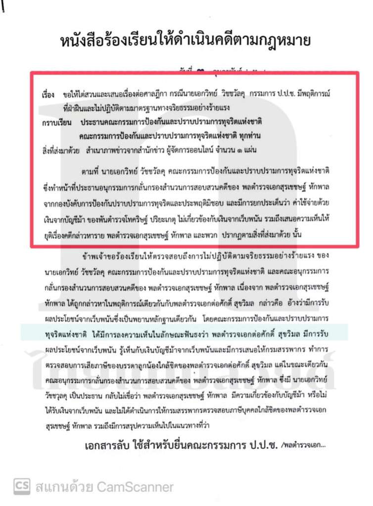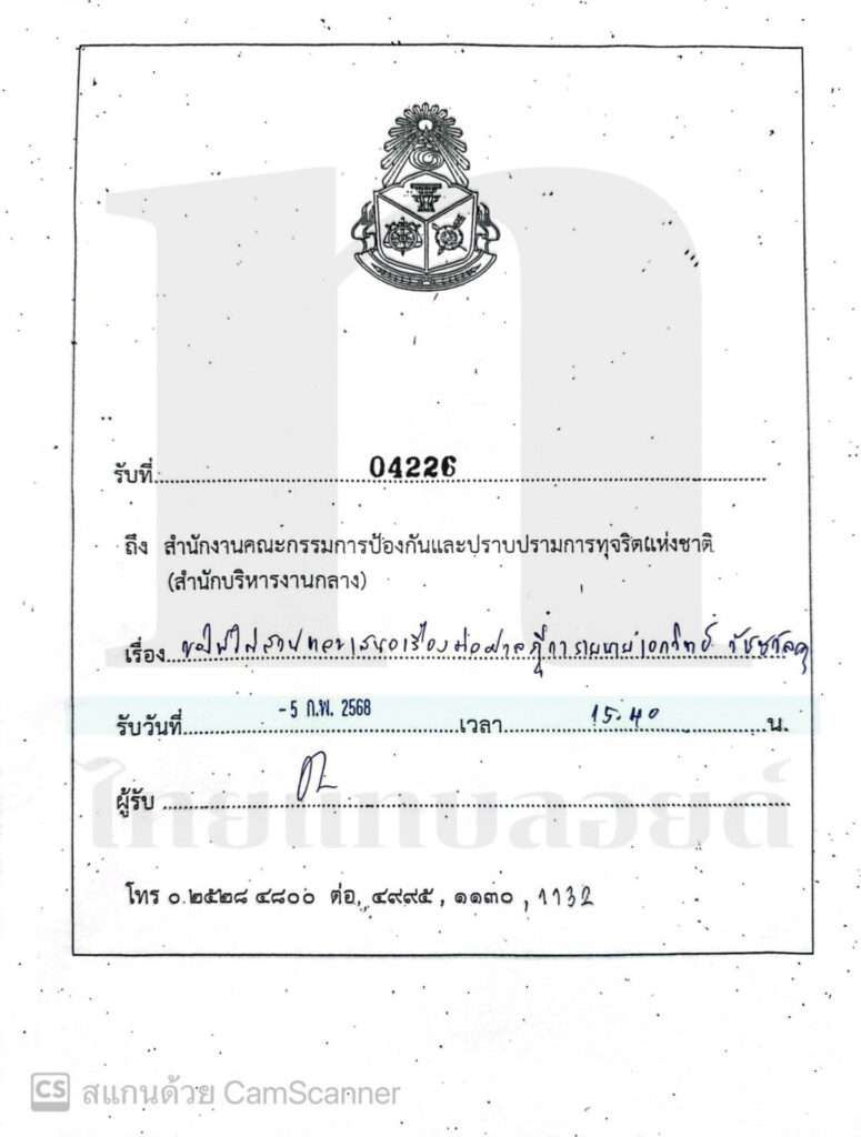 “เรื่อง แจ้งข้อเท็จจริงและส่งเอกสารหลักฐานเพิ่มเติม เรียน นายภัทรศักดิ์ วรรณแสง กรรมการ ป.ป.ช.อ้างถึง (3 ) หนังสือสำนักงาน ป.ป.ช. ลับ ที่ปช.000660/1862 ลงวันที่ 26 กรกฎาคม 2567 หนังสือกองบัญชาการตำรวจนครบาล ลับ ที่ ตช 0015 (น)2)/ 11369 ลงวันที่ 27 สิงหาคม สิ่งที่ส่งมาด้วย -(1 ) ข่าวเผยแพร่ของ สำนักงาน ป.ป.ช. ฉบับลนที่ 16 ธันวาคม 2567 จำนวน 2 แผ่น -(2) เอกสารข่าวจากสำนักงานข่าว THE ROOMCCOWNANE เผยแพร่เมื่อวันที่ 18 ธันวาคม 2567)-(3) เอกสารข่าวจากสำนักงานข่าว THE ROOM 44 CHANAL เผยแพร่เมื่อวันที่ ที่ 21 ธันวาคม 2567 ตามหนังสือที่อ้างถึง (1 ) สำนักงาน ป.ป.ช. โดยนางดารณี ธรเสนา ผู้อำนวยการสำนักไต่สวนทุจริตภาครัฐ 1 หัวหน้าพนักงานไต่สวน ขอทราบข้อเท็จจริงและขอเอกสารหลักฐานจากกองบัญชาการตำรวจนครบาล เพื่อนำไปประกอบการพิจารณาของคณะกรรมการ ป.ป.ช.กรณีได้ส่งเรื่องที่มีผู้มากล่าวหาเจ้าพนักงานของรัฐว่า เรียกรับทรัพย์สินที่เชื่อว่าได้มาจากผู้ต้องหาในคดีเว็บพนันออนไลน์ และต่อมากองบัญชาการตำรวจนครบาลได้มีหนังสือแจ้งเท็จจริงและส่งเอกสารหลักฐาน เท่าที่ทำการสืบสวนสอบสวนได้ในขณะนั้น ให้กับคณะกรรมการ