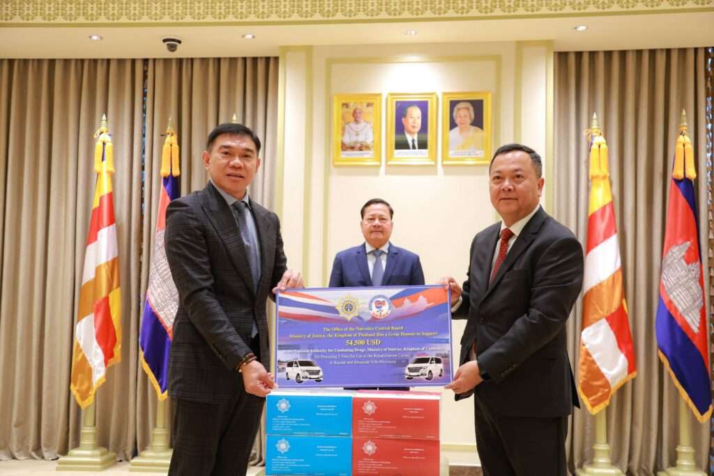 ในพิธีส่งมอบยานพาหนะ (รถตู้) และชุดตรวจสารเสพติด พลตำรวจโท ภาณุรัตน์ หลักบุญ เป็นประธานมอบยานพาหนะ (รถตู้) จำนวน 2 คัน ให้แก่ศูนย์บำบัดฟื้นฟูผู้ติดยาเสพติดจังหวัดกันดาลและจังหวัดพระสีหนุ รวมถึงชุดตรวจสารเสพติด จำนวน 10,000 ชุด ให้แก่สำนักงานคณะกรรมการต่อสู้ยาเสพติดแห่งชาติกัมพูชา (National Authority for Combating Drugs: NACD) เพื่อเสริมประสิทธิภาพในการทำงานและเฝ้าระวังการแพร่ระบาดของยาเสพติด โดยมีพลตำรวจเอกเมียะส์ วีฤทธิ์ เลขาธิการ NACD เป็นผู้รับมอบ และ ฯพณฯ สันติบัณฑิต เนต สาเวือน ร่วมเป็นสักขีพยาน พิธีดังกล่าวยังถือเป็นส่วนหนึ่งของการเฉลิมฉลองวาระครบรอบ 75 ปี แห่งการสถาปนาความสัมพันธ์ทางการทูตระหว่างไทยและกัมพูชา ในปี 2568 ซึ่งตลอดระยะเวลา 27 ปีที่ผ่านมา สองประเทศได้ร่วมมือกันอย่างใกล้ชิดในการแก้ไขปัญหายาเสพติด ทั้งในด้านการปราบปรามยาเสพติด การควบคุมสารตั้งต้น การป้องกัน และการบำบัดรักษาผู้ติดยาเสพติด โดยยึดหลัก “ผู้เสพคือผู้ป่วย” เพื่อให้บุคคลเหล่านี้ได้รับโอกาสกลับคืนสู่สังคมอย่างมีศักดิ์ศรี