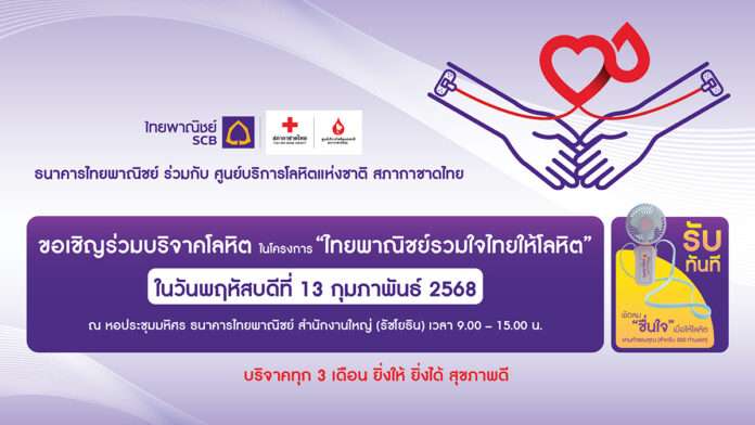 ธนาคารไทยพาณิชย์ ร่วมกับ ศูนย์บริการโลหิตแห่งชาติ สภากาชาดไทย ขอเชิญร่วมบริจาคโลหิต เติมเต็มโลหิตคงคลัง ในเดือนแห่งความรัก ภายใต้โครงการ “ไทยพาณิชย์รวมใจไทยให้โลหิต” ในวันพฤหัสบดีที่ 13 กุมภาพันธ์ 2568 เวลา 9.00-15.00 น. ณ หอประชุมมหิศร ธนาคารไทยพาณิชย์ สำนักงานใหญ่ (รัชโยธิน) เพื่อแสดงออกซึ่งความรัก แบ่งปันต่อเพื่อนมนุษย์ และให้มีปริมาณโลหิตเพียงพอต่อการรักษาพยาบาลผู้ป่วยทั่วประเทศ ยังมีผู้ป่วยจำนวนมากที่กำลังรอรับโลหิตเพื่อต่อลมหายใจ ทุก ๆ การบริจาคโลหิต 1 ครั้ง สามารถนำไปช่วยชีวิตผู้ป่วยได้มากกว่า 3 ชีวิต สำหรับ 500 ท่านแรกที่ร่วมบริจาคโลหิต รับทันทีพัดลมมือถือ “ชื่นใจ” แทนคำขอบคุณ