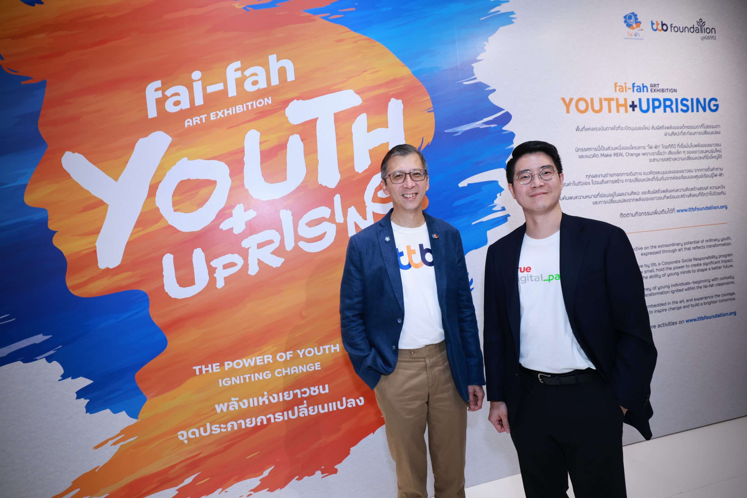 ศูนย์เรียนรู้ไฟ-ฟ้า ภายใต้การดำเนินงานของมูลนิธิ ทีทีบี จึงเป็นมากกว่ากิจกรรมเพื่อสังคม แต่คือจุดเริ่มต้นของการสร้างอนาคตที่ดีขึ้น เพราะทีทีบี เชื่อว่าเมื่อเยาวชนได้รับโอกาสและพื้นที่ในการพัฒนาศักยภาพของตัวเอง พวกเขาจะกลายเป็นพลังสำคัญที่เปลี่ยนแปลงสังคมในทางที่ดีขึ้นได้อย่างยั่งยืน นิทรรศการศิลปะ “fai-fah Art Exhibition: Youth + Uprising” จึงเป็นอีกหนึ่งโอกาสของเด็ก ๆ เป็นเสมือนเวทีที่สะท้อนถึงความสำเร็จและแรงบันดาลใจที่บอกเล่าเรื่องราวการเปลี่ยนแปลงของเด็กไฟ-ฟ้า นอกจากเป็นก้าวสำคัญที่ทำให้บุคคลทั่วไปได้เห็นพลังและศักยภาพของเด็ก ๆ รวมถึงความภาคภูมิใจว่าผลงานของเขาเป็นที่ยอมรับในวงกว้างแล้ว เชื่อว่ายังจะสร้างแรงบันดาลใจขับเคลื่อนสังคมและผู้คนเปลี่ยนแปลงในทิศทางที่ดีขึ้นด้วย”