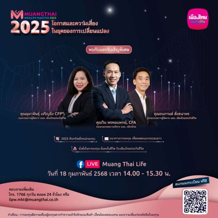 บริษัท เมืองไทยประกันชีวิต จำกัด (มหาชน) จัดงานสัมมนา Muangthai Wealth Master 2025 หัวข้อ “โอกาสและความเสี่ยง ในยุคของการเปลี่ยนแปลง” ในวันอังคาร ที่ 18 กุมภาพันธ์ 2568 เวลา 14.00 – 15.30 น. ในรูปแบบออนไลน์ Live Streaming ผ่านทาง Facebook : Muang Thai Life เพื่ออัปเดตภาวะเศรษฐกิจ มุมมองการลงทุนทั่วโลก พร้อมชี้โอกาสและความเสี่ยงการลงทุนในปี 2025 โดยได้รับเกียรติจากคุณวิน พรหมแพทย์ ประธานกรรมการบริหาร บลจ. กสิกรไทย เป็นแขกรับเชิญพิเศษ ร่วมด้วยคุณอุมาพันธุ์ เจริญยิ่ง รองกรรมการผู้จัดการ และคุณชนกานต์ ตั่งธนาพร ผู้ช่วยกรรมการผู้จัดการ บมจ.เมืองไทยประกันชีวิต