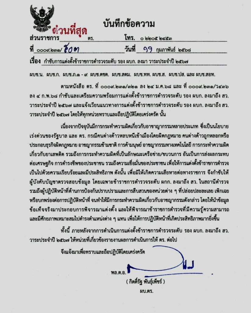 ใจความว่า ตามหนังสือ ตร. ที่ 0009.231/321 ลง 24 ม.ค.2568 และ ที่ 0009.231/ว436 ลง 4 ก.พ.2568 กำชับและเตรียมความพร้อมการแต่งตั้งข้าราชการตำรวจระดับ รอง ผบก. ลงมาถึง สว.วาระประจำปี 2567 และแจ้งเวียนแนวทางการแต่งตั้งข้าราชการตำรวจระดับ รอง ผบก. ลงมาถึง สว.วาระประจำปี 2567 โดยให้ทุกหน่วยทราบและถือปฏิบัติโดยเคร่งครัด นั้น