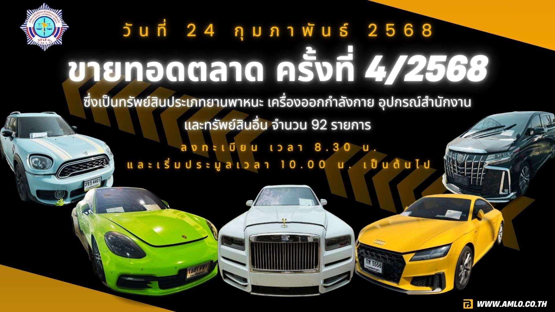 สำนักงาน ปปง. จะทำการขายทอดตลาดทรัพย์สินโดยวิธีการประมูลปากเปล่า ครั้งที่ 4/2568 ซึ่งเป็นทรัพย์สินประเภทยานพาหนะ เครื่องออกกำลังกาย อุปกรณ์สำนักงาน และทรัพย์อื่น จำนวน 92 รายการ โดยจะทำการขายทอดตลาดทรัพย์สินในวันที่ 24 กุมภาพันธ์ 2568 ลงทะเบียนตั้งแต่เวลา 08.30 น.