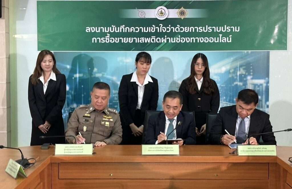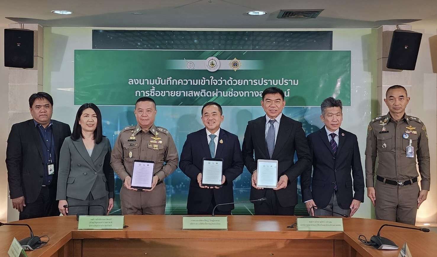 โดยมีศาสตราจารย์พิเศษวิศิษฏ์ วิศิษฏ์สรอรรถ ปลัดกระทรวงดิจิทัลเพื่อเศรษฐกิจและสังคม พล.ต.ท.ภาณุรัตน์ หลักบุญ เลขาธิการสำนักงานคณะกรรมการป้องกันและปราบปรามยาเสพติด (ป.ป.ส.) พล.ต.ต.อธิป พงษ์ศิวาภัย ผบก.ปอท. ,นางสาวยุพาภรณ์ ศิริกิจพาณิชย์กูล ผู้ช่วยปลัดกระทรวงดิจิทัลเพื่อเศรษฐกิจและสังคม ,นายปฤณ เมฆานันท์ ผู้อำนวยการสำนักปราบปรามยาเสพติด สำนักงานคณะกรรมการป้องกันและปราบปรามยาเสพติด (ป.ป.ส.) เข้าร่วมลงนาม
