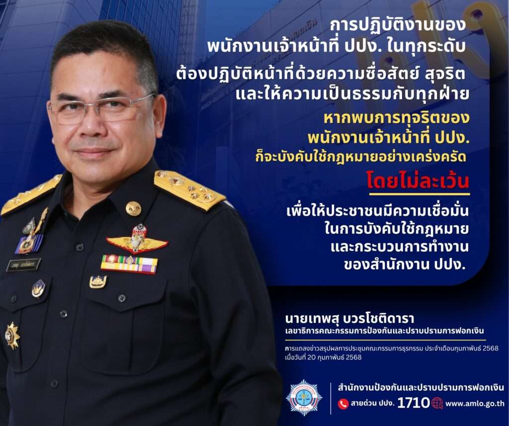 อนึ่ง เลขาธิการ ปปง. ได้เน้นย้ำว่า การปฏิบัติงานของพนักงานเจ้าหน้าที่ ปปง. ในทุกระดับต้องปฏิบัติหน้าที่ด้วยความซื่อสัตย์ สุจริต และให้ความเป็นธรรมกับทุกฝ่าย หากพบการทุจริตของพนักงานเจ้าหน้าที่ ปปง. ก็จะบังคับใช้กฎหมายอย่างเคร่งครัด โดยไม่ละเว้น เพื่อให้ประชาชนมีความเชื่อมั่นในการบังคับใช้กฎหมายและกระบวนการทำงานของสำนักงาน ปปง. ทั้งนี้ หากประชาชนพบเห็นการกระทำที่เข้าข่ายการทุจริต ของเจ้าหน้าที่สำนักงาน ปปง. สามารถแจ้งข้อร้องเรียนได้โดยตรงที่สายด่วน ปปง. 1710 และเว็บไซต์สำนักงาน ปปง. www.amlo.go.th รวมทั้งช่องทางออนไลน์อื่น ๆ โดยข้อมูลการร้องเรียนดังกล่าวสำนักงาน ปปง. จะเก็บรักษาไว้เป็นความลับ