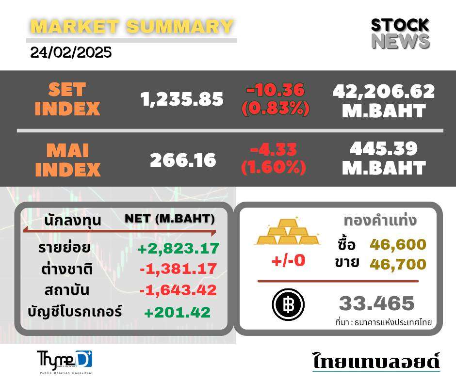 SET ปิดวันนี้ที่ 1,235.85 จุด ลดลง 10.36 จุด (-0.83%) มูลค่าซื้อขาย 42,248.67 ล้านบาท
