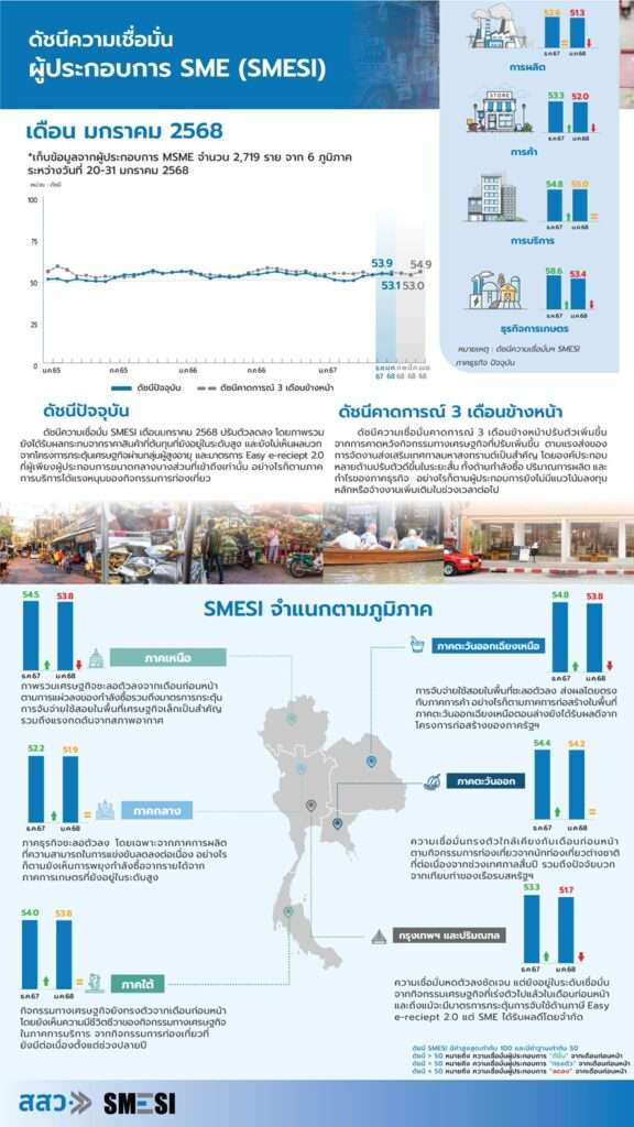 สำหรับดัชนีความเชื่อมั่นผู้ประกอบการ SME (SMESI) รายภาคธุรกิจ พบว่า ภาคการผลิต อยู่ที่ระดับ 51.3 หดตัวจากระดับ 52.6 จากเดือนก่อนหน้า มีสาเหตุจากจำนวนยอดขายธุรกิจที่เพิ่มขึ้นสูงในช่วงเวลาก่อนหน้าโดยเฉพาะในกลุ่มอาหารและเสื้อผ้า แม้จะอยู่ในช่วงเวลาการทำงานปกติ แต่กลุ่มเหล็ก พลาสติก และยาง ยังไม่สามารถขยายกำลังการผลิตได้ เนื่องจากสถานการณ์เศรษฐกิจมีแนวโน้มที่ไม่แน่นอน ทำให้ผู้ประกอบการระมัดระวังการลงทุน ภาคการค้าอยู่ที่ระดับ 52.0 ลดลงจากระดับ 53.3 จากเดือนก่อนหน้า โดยหดตัวตามกำลังซื้อที่ชะลอลง หลังจากเร่งตัวในเดือนก่อนหน้า ขณะที่ปัจจัยกระตุ้นเศรษฐกิจยังไม่ส่งผลชัดเจน ทั้งโครงการกระตุ้นเศรษฐกิจผ่านผู้สูงอายุ ที่เริ่มช่วงสิ้นเดือน และโครงการ Easy e-Receipt 2.0 ซึ่งยังเป็นประโยชน์กับธุรกิจขนาดกลางขึ้นไป ภาคการบริการอยู่ที่ระดับ 55.0 เพิ่มขึ้นจากระดับ 54.8 ซึ่งทรงตัวต่อเนื่องจากเดือนก่อนหน้าที่ได้แรงหนุนจากภาคท่องเที่ยวที่ยังคึกคักหลังเทศกาล ส่งผลให้ธุรกิจยังมีผู้ใช้บริการต่อเนื่อง โดยเฉพาะในพื้นที่ท่องเที่ยวสำคัญ เช่น ภาคใต้ ภาคตะวันออก และเชียงใหม่ ภาคธุรกิจการเกษตรอยู่ที่ระดับ 53.4 ลดลงจากระดับ 58.6 โดยหดตัวลงอย่างชัดเจนจากปริมาณผลผลิตที่ลดลง หลังการเก็บเกี่ยวพืชไร่หลายชนิด แม้ราคาสินค้ายังอยู่ในระดับสูง แต่กำไรของผู้ประกอบการไม่ได้เพิ่มขึ้นมากนัก เนื่องจากมีการทยอยขายสินค้าล่วงหน้าแล้ว