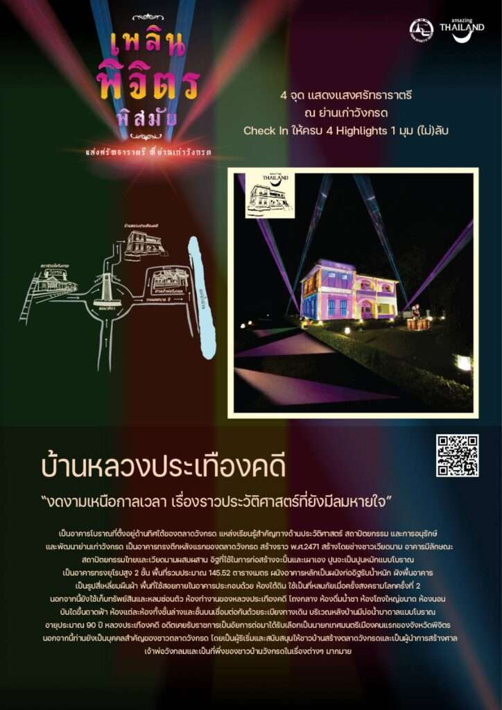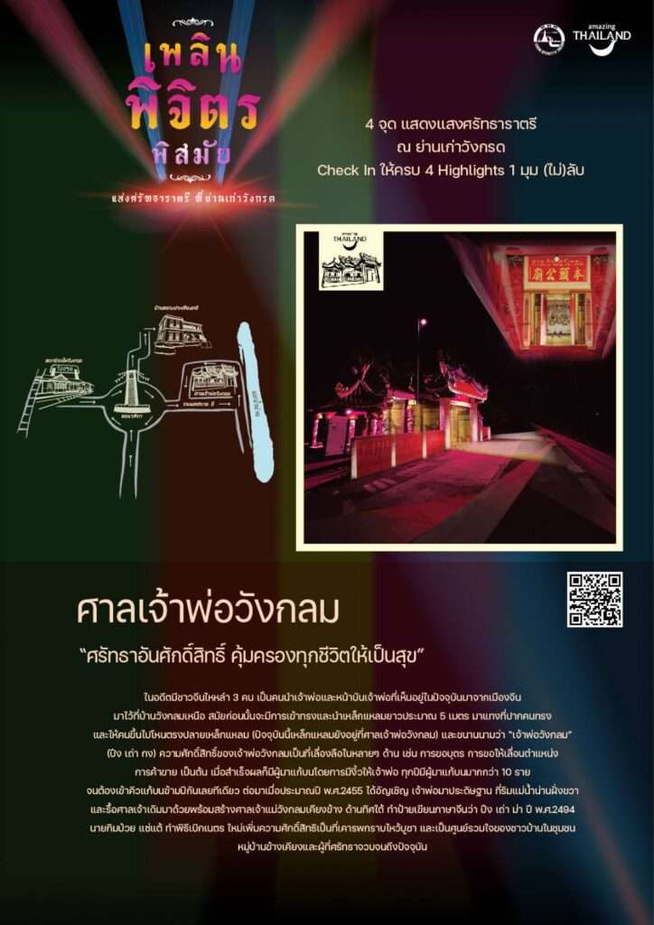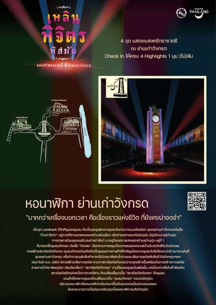 แต่ดูสดใสจากการแสดงแสงไฟ (Light Up) และมุม (ไม่) ลับ ของย่านเก่าวังกรด ที่สวยงามตระการตา อย่าง สถานีรถไฟวังกรด บ้านหลวงประเทืองคดี ซึ่งเป็นตึก 2 ชั้นหลังแรกของที่นี่ และทุกวันนี้ได้กลายเป็นพิพิธภัณฑ์ บอกเล่าเรื่องราวของชาววังกรดที่น่าจดจำ ศาลเจ้าพ่อวังกลม ที่คนนิยมมาขอโชคลาภและสำเร็จกันมาแล้ว มากมาย รวมทั้งหอนาฬิกาสุดคลาสสิค ที่ใครเห็นแล้วเป็นต้องลั่นชัตเตอร์รัว ๆ เพื่อเก็บภาพความประทับใจ นอกจากนี้ยังได้เที่ยวเพลิน เดินชิมลิ้มรสอาหารอร่อยในตำนานกว่า 20 ร้านเด็ดสะระตี่ ที่ผู้คนย่านนี้
