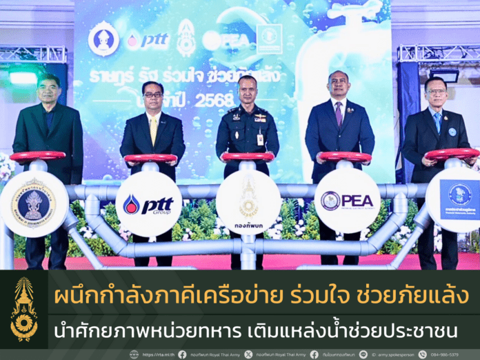 ทบ. ผนึกกำลังภาคีเครือข่ายเปิดโครงการ “ราษฎร์ รัฐ ร่วมใจ ช่วยภัยแล้ง” ต่อเนื่องปีที่ 27 นำศักยภาพหน่วยทหารทั่วประเทศ เติมแหล่งน้ำช่วยประชาชน