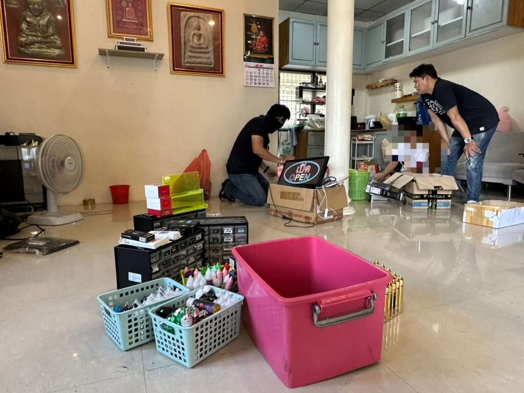 ล่าสุดวันนี้ (7 มีนาคม 2568) เจ้าหน้าที่ตำรวจได้สนธิกำลังกันเข้าทำการตรวจค้นบ้านหลังดังกล่าว ผลการตรวจค้นพบของกลางเป็นบุหรี่ไฟฟ้าจำนวนหลายยี่ห้อคละกัน ประมาณ 35,600 ชิ้น รวมมูลค่ากว่า 1 ล้านบาท และยังตรวจพบอุปกรณ์ที่ใช้ในการเปิดร้านจำหน่ายบุหรี่ไฟฟ้าอีกจำนวนหนึ่ง การปฏิบัติการในครั้งนี้ เจ้าหน้าที่ตำรวจได้จับกุมผู้ต้องหา 2 ราย แจ้งข้อหา “ฝ่าฝืนคำสั่งคณะกรรมการคุ้มครองผู้บริโภค ขายสินค้าที่คณะกรรมการคุ้มครองผู้บริโภคสั่งห้ามขาย (บุหรี่ไฟฟ้าและน้ำยาสำหรับเติมบุหรี่ไฟฟ้า)” ตามคำสั่งคณะกรรมการคุ้มครองผู้บริโภค ที่ 9/2558 และ “ซ่อนเร้น ช่วยจำหน่าย ช่วยพาเอาไปเสีย ซื้อ รับจำนำ หรือรับไว้โดยประการใดซึ่งของอันตนพึงรู้ว่าเป็นสิ่งต้องห้ามนำเข้าในราชอาณาจักร” ตามมาตรา 256 พ.ร.บ.ศุลกากร พ.ศ.2560