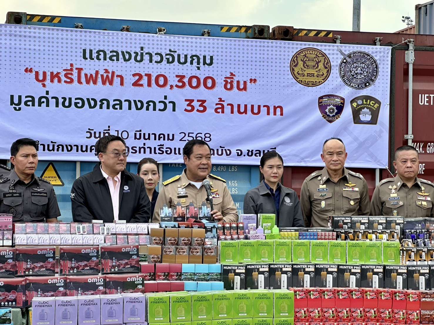 ด้าน นายธีรัชย์ อธิบดีกรมศุลกากร กล่าวว่า ทางกรมศุลกากร ได้สั่งกำชับเพิ่มความเข้มงวดเพื่อตอบสนองนโยบายอย่างเคร่งครัด พร้อมกำชับให้เจ้าหน้าที่เพิ่มการเฝ้าระวังการลักลอบนำเข้าและส่งออกบุหรี่ไฟฟ้าทุกช่องทาง รวมถึงการบูรณาการร่วมกับหน่วยงานที่เกี่ยวข้องอย่างต่อเนื่องจากการวิเคราะห์ข้อมูลเกี่ยวกับความเสี่ยงในการนำเข้าสินค้าผิดกฎหมาย โดยเฉพาะบุหรี่ไฟฟ้าที่มีการลักลอบนำเข้าหรือผ่านแดน กรมศุลกากรมีการรรรวบรวมข้อมูลการข่าวและจับตาพฤติการณ์ของผู้ที่ที่มีความเสี่ยงในการลักลอบนำบุหรี่ไฟฟ้าเข้ามาในประเทศไทยอย่างใกล้ชิด ซึ่งกรมศุลกากรได้ดำเนินการมาอย่างต่อเนื่องจนเมื่อวันที่ 7 มีนาคม 2568 เวลา 1800 น. กรมศลกากร โดยสำนักงานศลกากรท่าเรือแหลมฉบัง และกองสืบสวนและปราบปราบปรามกรมสอบสวนคดีพิเศษ สถานีตำรวจภูธรเมืองชลบุรี สถานีตำรวจภูธธรแหลมฉบัง และตำรวจภูธรภาค 2 ร่วมกัมกันตรวจสอบตู้สินค้าผ่านแดน จำนวน 1 ตู้คอนเทนเนอร์ ณ ท่าเรือ LCMT (40) สำนักงานศุลกากกรท่าเรือแหลมฉบัง ประเทศต้นทางจาก CHINA ส่งไปยังประเทศ Myannar นำเข้าสินค้าผ่านท่าเรือแหลมฉบัง และจะไปทำการตรวจปล่อยที่ด่านศุลกากรแม่สอด สำนักงานศุลกากรภาคที่ 3 โดยสำแดงสินค้าเป็นอุปกรณ์อิเล็กทรอนิกส์ อุปกรณ์ทางการแพทย์ส่วนประกอบรถยนต์ เครื่องจักรและอื่น ๆ จำนวน 1,173 กล่อง ผลการตรวจสอบพบบหรี่ไฟฟ้าชนิดใช้แล้วทิ้ง 6,000 ชิ้นมูลค่า 1,200,000 บาท น้ำยาบุหรี่ไฟฟ้า 6,000 ชิ้น มูลค่า 900,000 บาท หัวพ็อดบุหรี่ไฟฟ้าที่ภายในบรรจุน้ำยาบุหรี่ไฟฟ้า190,100 ชิ้น มูลค่า 28,515,00 บาท และเครื่องบุหรี่ไฟฟ้า พร้อมน้ำยาบุหรี่ไฟฟ้า 8,200 ชิ้น มูลค่า 2,460,000 บาท รวมทั้งหมด 210,300 ชิ้น มูลค่ารวม 33,075,000 บาท อันเป็นความผิดตาม พ.ร.บ.ศุลกากร พ.ศ. 2560 และเป็นของต้องห้ามตามประกาศกระทรวงพาณิชย์เรื่อง สินค้าต้องห้ามนำผ่านราชอามาจักร พเศ. 2559 ประกอบประกาศกระทรวงพาณิชย์ เรื่อง กำหนดให้บารากู่และบารากไฟฟ้าหรือบุหรี่ไฟฟ้าเป็นสินค้าที่ต้องห้ามในการนำเข้ามาในราชยาจักร พเศ2557 และประกาศกรมศุลกากรที่ 185/2564 เรื่อง พิธีการศุลกากรว่าด้วยการผ่านแดนทางอิเล็กทรอนิกส์ ลงวันที่ 1 ธันวาคม 2564 ข้อ 6 ในกรณีนี้นี้จะไม่มีการะงับคดีในชั้นศุลกากรสำหรับสถิติการจับกุมบุหรี่ไฟฟ้า ในปีงบประมาณ 2568 (1 ตุลาคม 2567 – – 7 มีนาคม 2568)จับกุมได้ 298 คดี มูลค่า 73.25 ล้านบาท ”อธิบดีกรมศุลกากร กล่าว“