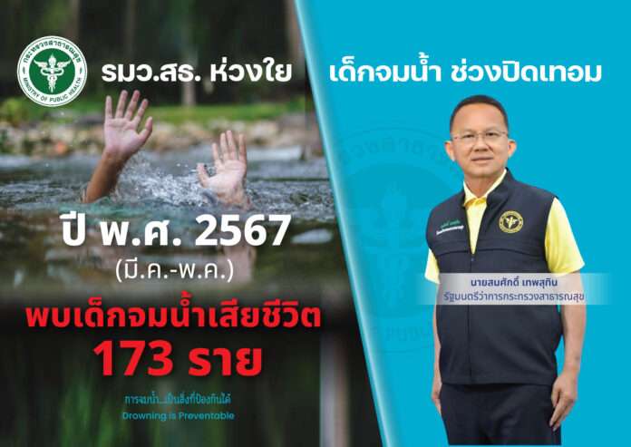 นายสมศักดิ์ เทพสุทิน รัฐมนตรีว่าการกระทรวงสาธารณสุข เปิดเผยว่า สถานการณ์เด็กจมน้ำมักเกิดขึ้นเป็นประจำทุกปีในช่วงปิดเทอมฤดูร้อน (เดือนมีนาคม – พฤษภาคม) กระทรวงสาธารณสุข จึงบูรณาการความร่วมมือกับภาคีเครือข่ายป้องกันและแก้ไขปัญหาอย่างต่อเนื่อง โดยในปี 2567 พบเด็กอายุต่ำกว่า 15 ปี จมน้ำเสียชีวิตถึง 173 ราย เฉลี่ยวันละเกือบ 2 ราย มากสุดในเดือนมีนาคม รองลงมา คือ เมษายน และพฤษภาคม ส่วนใหญ่อายุ 10 – 14 ปี รองลงมา อายุ 5 – 9 ปี และอายุ 0 – 4 ปี เพศชายจมน้ำสูงกว่าเพศหญิงถึง 2.8 เท่าตัว พบเสียชีวิตมากสุดที่ นครราชสีมา รองลงมา คือ ปัตตานี ศรีสะเกษและอุดรธานี โดยกว่าร้อยละ 72 เป็นแหล่งน้ำเพื่อการเกษตรและแหล่งน้ำตามธรรมชาติ (บ่อขุด/ สระน้ำ/ คลอง/ แม่น้ำ) สาเหตุเกิดจากการไปเล่นน้ำมากที่สุด ร้อยละ 72.3 โดยมีปัจจัยเสี่ยงสำคัญ คือ เด็กขาดการดูแล และขาดความรู้เรื่องแหล่งน้ำเสี่ยง ซึ่งพบว่าขณะเกิดเหตุมากกว่าครึ่งอยู่กับเพื่อนและเกือบทั้งหมดไม่สวมเสื้อชูชีพ โดยภายหลังจมน้ำเด็กจะเสียชีวิต ถึงร้อยละ 65.1