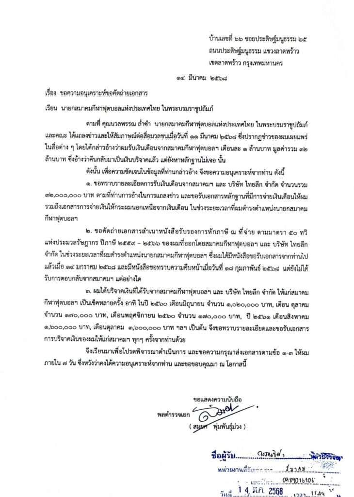 2.ขอคัดถ่ายเอกสารสำเนาหนังสือรับรองการหักภาษี ณ ที่จ่าย ตามมาตรา 50 ทวิ แห่งประมวลรัษฎากร ปีภาษี 2559 – 2566 ของผมที่ออกโดยสมาคมกีฬาฟุตบอลฯ และ บริษัท ไทยลีก จำกัด ในช่วงระยะเวลาที่ผมดำรงตำแหน่งนายกสมาคมกีฬาฟุตบอลฯ ซึ่งผมได้มีหนังสือขอรับเอกสารจากท่านไปแล้วเมื่อ 1 มกราคม 2568 และมีหนังสือขอทราบความคืบหน้าเมื่อวันที่ 18 กุมภาพันธ์ 2568 แต่ยังไม่ได้รับการตอบกลับจากสมาคมฯ แต่อย่างใด