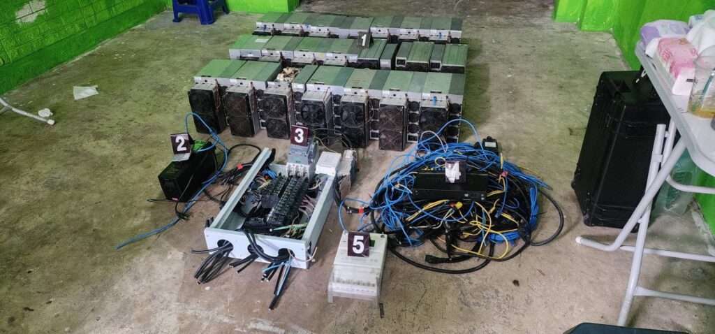 จากการตรวจค้นบ้านพักของบุคคลที่คาดว่าเป็นหัวหน้าขบวนการ พบว่าบุคคลดังกล่าวจบวิศวกรไฟฟ้า ทำงานในบริษัทเอกชนแห่งหนึ่ง พร้อมอุปกรณ์ควบคุมเหมืองขุดบิทคอยน์แบบออนไลน์ โดยให้การยอมรับว่าตนเองมีหน้าที่ดูแลระบบทั้งหมด ทั้งการหาสถานที่ตั้งเหมือง การนำเข้าเครื่องขุด การติดตั้งอุปกรณ์ รวมถึงการตั้งค่าระบบการขุดแบบออนไลน์ โดยเจ้าหน้าที่ได้ทำการตรวจยึดของกลาง และอยู่ในระหว่างการรวบรวมพยานหลักฐานเพื่อขยายผลผู้ร่วมขบวนการทั้งหมดดำเนินคดีต่อไป