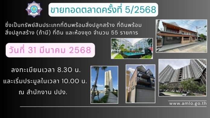 ซึ่งเป็นทรัพย์สินประเภทที่ดินพร้อมสิ่งปลูกสร้าง ห้องชุด อาคาร และที่ดิน จำนวน 55 รายการ โดยจะทำการขายทอดตลาดทรัพย์สินในวันที่ 31 มีนาคม 2568 ลงทะเบียนตั้งแต่เวลา 08.30 น.เริ่มประมูลเวลา 10.00 น. เป็นต้นไป ณ ห้องประชุม 101 ชั้น 1 อาคารสำนักงาน ปปง. โดยมีรายการทรัพย์สินที่น่าสนใจ ดังนี้
