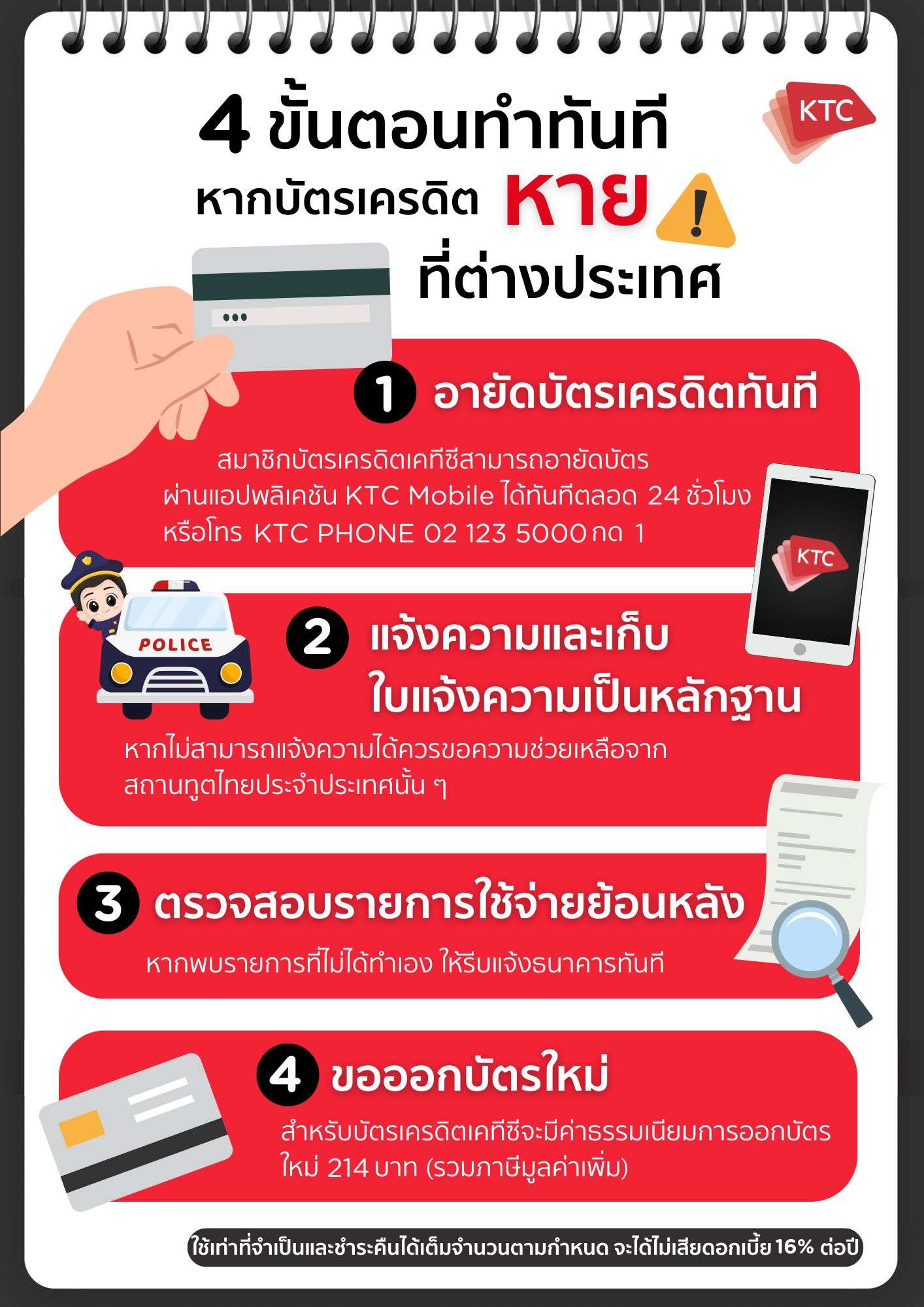 ช่วงปิดเทอมแบบนี้ถือเป็นช่วงเวลาที่หลายครอบครัวรอคอยที่จะได้พาบุตรหลานไปท่องเที่ยวต่างประเทศเพื่อเปิดประสบการณ์ใหม่ๆ และพักผ่อนจากการเรียนหรือทำงาน แต่ท่ามกลางความสนุกสนานหากเกิดเหตุการณ์ไม่คาดฝัน เช่น บัตรเครดิตสูญหายหรือถูกขโมยอาจสร้างปัญหายุ่งยากและกระทบกับแผนการเดินทางได้ “เคทีซี” หรือ บริษัท บัตรกรุงไทย จำกัด (มหาชน) แนะนำ 4 ขั้นตอนสำคัญที่ต้องปฏิบัติทันทีเมื่อเกิดเหตุการณ์นี้ขึ้น