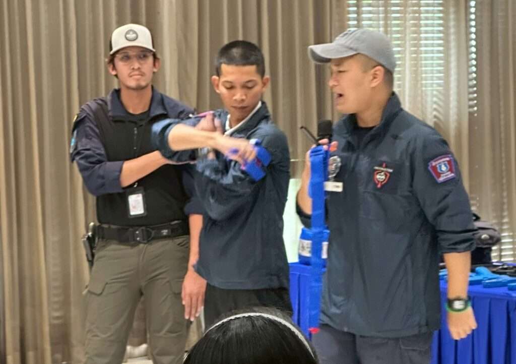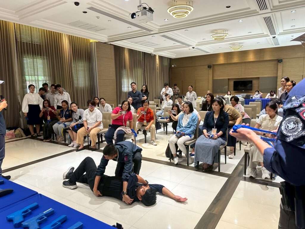 โดยการอบรมครั้งนี้เจ้าหน้าที่ได้จัดอบรมให้ความรู้ทั้งในภาคทฤษฎีและปฏิบัติ ประกอบไปด้วย ทฤษฏี Active Shooter หลักการหนี ซ่อน สู้, การปฐมพยาบาลเบื้องต้น เคลื่อนย้ายผู้ได้รับบาดเจ็บ,การปฏิบัติเมื่อพบวัตถุระเบิดแสวงเครื่อง (IED) การฝึกปฏิบัติในสถานการณ์จำลอง นอกจากนี้ยังได้แนะนำวิธีการปฏิบัติตนอย่างปลอดภัยเมื่อเกิดเหตุแผ่นดินไหว ตามแนวทางของกรมป้องกันและบรรเทาสาธารณภัย (ปภ.) โดยยึดหลัก “หมอบ – ป้อง – เกาะ” (Drop, Cover, Hold On) ประกอบไปด้วย1. หมอบ (Drop): ลดตัวลงกับพื้นเพื่อป้องกันการล้ม 2. ป้อง (Cover): ใช้แขนหรือสิ่งของปกป้องศีรษะและลำตัวจากวัตถุที่อาจตกลงมา และ 3. เกาะ (Hold On): จับยึดสิ่งที่มั่นคงไว้จนกว่าแรงสั่นสะเทือนจะหยุดลง