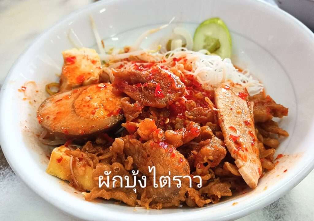 เมนูที่ 2 ผักบุ้งไต่ราว ซอสแดงเข้มข้นคลุกเคล้ามาบนเส้นหมี่ รองจานด้วยผักบุ้งลวก และแตงกวา ขายลูกชิ้นหมูทอดกรอบ และเครื่องต่างๆ ที่คล้ายกับโล่งโต้ง
