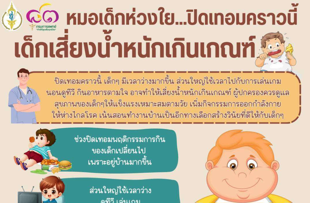 นายแพทย์ธนินทร์ เวชชาภินันท์ รองอธิบดีกรมการแพทย์ กล่าวว่า ช่วงปิดเทอมพฤติกรรมการกินของเด็กเปลี่ยนไป เพราะอยู่บ้านมากขึ้น ส่วนใหญ่ใช้เวลาว่างดูทีวี เล่นเกม มากเกินกว่า 2 ชั่วโมงต่อวัน เคลื่อนไหวหรือออกกำลังกายน้อยลง ทำให้ร่างกายขาดความสมดุล เลือกซื้ออาหารได้ตามใจ และมักเลือกซื้ออาหารจานด่วน รวมไปถึงขนมกรุบกรอบ น้ำหวาน และน้ำอัดลม ที่มีคุณค่าทางอาหารไม่มากแต่ให้พลังงานสูง ทำให้เสี่ยงต่อการขาดสารอาหารที่จำเป็น และเกิดโรคไม่ติดต่อเรื้อรัง เพราะพลังงานที่ใช้ไปไม่มาก ที่เหลือจะเก็บสะสมในรูปไขมัน อยู่ตามส่วนต่างๆ ของร่างกายทำให้น้ำหนักเกินเกณฑ์ เสี่ยงเป็นโรคอ้วน นอกจากนี้ ยังอาจเกิดภาวะแทรกซ้อนต่างๆตามมาได้ ผู้ปกครองควรจัดกิจกรรมที่เหมาะสมให้เด็กระหว่างปิดเทอม ลดการใช้หน้าจอ เพิ่มการเล่นกีฬา งดการซื้ออาหารจานด่วน และเพิ่มการรับประทานอาหารสุขภาพ