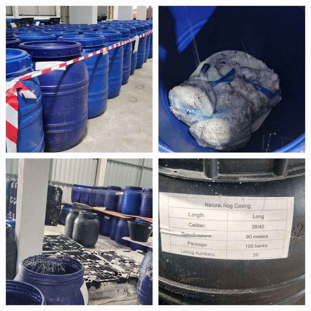 เจ้าหน้าที่ตำรวจและเจ้าพนักงานปศุสัตว์จึงได้ดำเนินการตรวจสอบของภายในถังต่าง ๆ ผลการตรวจสอบปรากฏว่า พบไส้สัตว์ไม่ทราบชนิดหมักด้วยเกลือ ซึ่งเชื่อได้ว่าเป็นไส้หมูหมักเกลือ บรรจุอยู่ในถุงกระสอบภายในถังต่าง ๆ จำนวน 514 ถัง ถังละประมาณ 80 กก. ตีเป็นมูลค่ากว่า 10 ล้านบาท และยังเชื่อได้ว่าเป็นสินค้าที่มีแหล่งกำเนิดจากต่างประเทศ เนื่องจากมีภาษาต่างประเทศแปะอยู่ตามถังต่าง ๆ ว่า “Natural Hog Casing” ซึ่งเชื่อได้ว่าเป็นสินค้าประเภทไส้ของหมู และยังเจอถุงกระสอบบรรจุภัณฑ์เป็นภาษาต่างประเทศที่ระบุว่าเป็นถุงยูเรีย (UREA) ทำมาจากประเทศเวียดนาม (MADE IN VIETNAM) ซึ่งเป็นถุงที่ใช้บรรจุไส้ของหมูดังกล่าวโดยไม่ถูกสุขลักษณะ ซึ่งอาจมีเชื้อหรือสารปนเปื้อนปะปนมาได้ ในเบื้องต้น น.ส.ชวดลฯ ซึ่งเป็นเจ้าของสถานที่ (ผู้ให้เช่า) แจ้งว่าสินค้าดังกล่าวทั้งหมดเป็นของชายสัญชาติจีนชื่อนายเฉินฯ (Mr.CHEN) ซึ่งเป็นผู้เช่าโกดังดังกล่าว โดยได้แจ้งว่าจะเช่าโกดังเพื่อเก็บอาหารสด เช่น ไส้สัตว์อบเกลือและแปรรูป คาดว่าเป็นการตระเตรียมเพื่อนำส่งร้านอาหารต่างๆ ที่มีการบริโภคอาหารประเภทไส้หมู เจ้าพนักงานตำรวจและเจ้าพนักงานปศุสัตว์จึงได้ดำเนินการอายัดสิ่งของดังกล่าว พร้อมทั้งดำเนินการเก็บตัวอย่างไส้สัตว์ดังกล่าวไปทำการตรวจหาชนิดและเชื้อโรคระบาด เพื่อจะได้ดำเนินคดีกับผู้ที่เกี่ยวข้องตามกฎหมายต่อไป