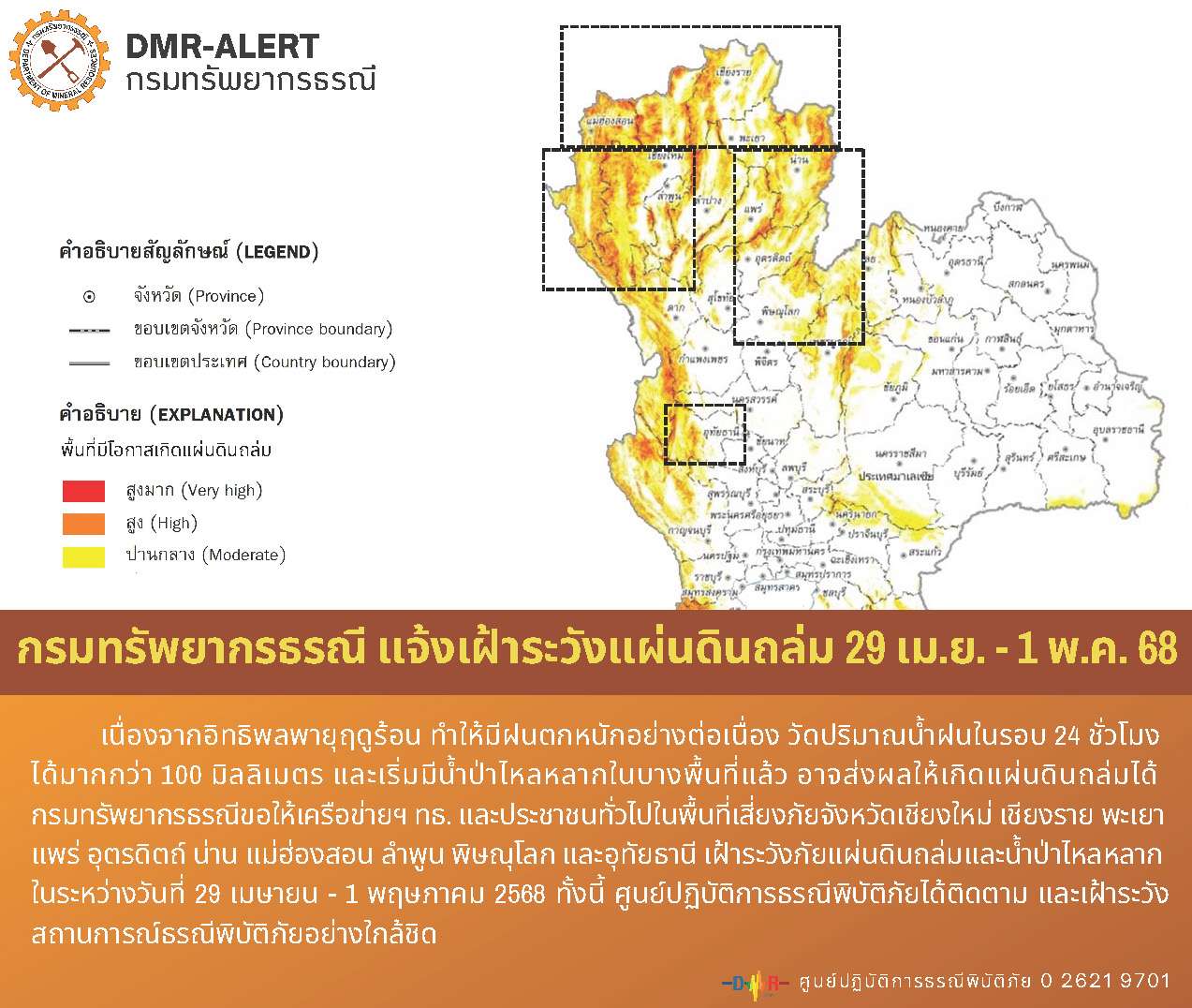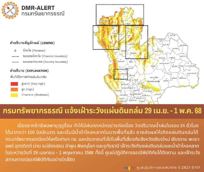 วันที่ 29 เม.ย. กรมทรัพยากรธรณี กระทรวงทรัพยากรธรรมชาติและสิ่งแวดล้อม แจ้งเฝ้าระวังแผ่นดินถล่มและน้ำป่าไหลหลาก ในเขตพื้นที่ภาคเหนือและภาคกลางตอนบน โดยขอให้อาสาสมัครเครือข่ายในพื้นที่จังหวัดเชียงใหม่ เชียงราย พะเยา แพร่ อุตรดิตถ์ น่าน แม่ฮ่องสอน ลำพูน พิษณุโลก และอุทัยธานี เฝ้าระวังภัยแผ่นดินถล่มและน้ำป่าไหลหลาก ในระหว่างวันที่ 29 เมษายน – 1 พฤษภาคม 2568 และขอให้เครือข่ายฯ ทธ. วัดปริมาณน้ำฝนอย่างต่อเนื่อง ทั้งนี้ ศูนย์ปฏิบัติการธรณีพิบัติภัย จะติดตามสถานการณ์อย่างใกล้ชิด
