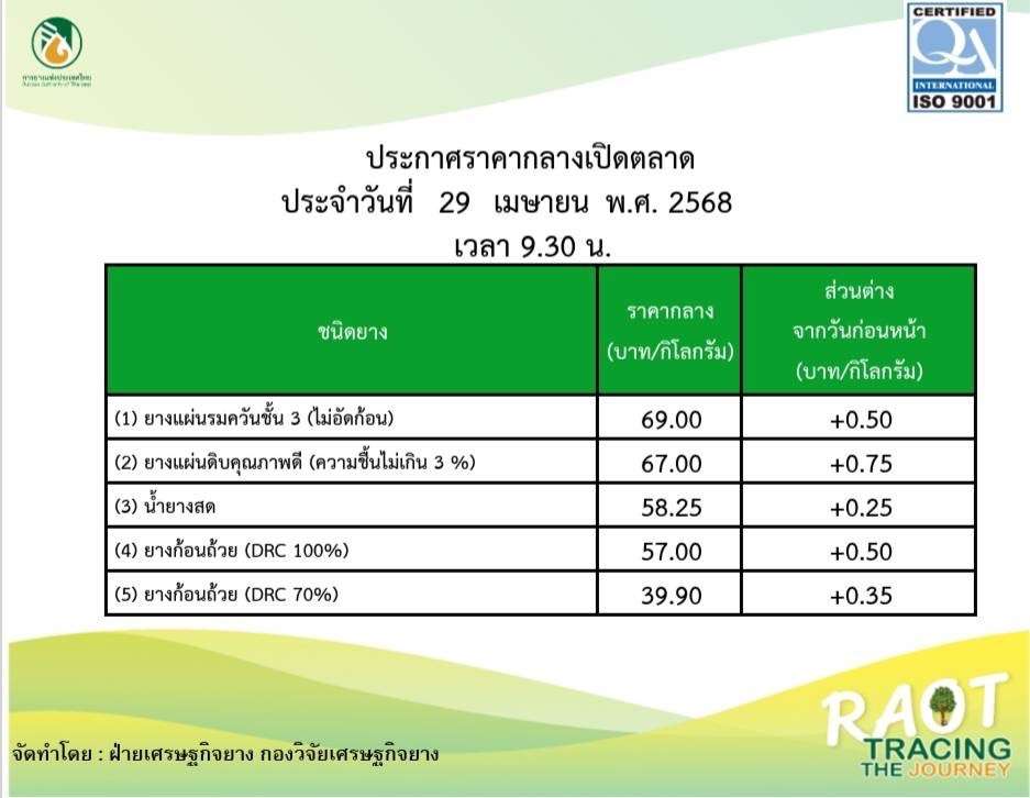 นางนฤมล กล่าวว่า ล่าสุดราคายางพาราทุกชนิดได้ปรับขึ้นมาอย่างต่อเนื่อง โดยราคากลางเปิดตลาดวันนี้( 29 เม.ย.)ยางแผ่นรมควันชั้น 3 (ไม่อัดก้อน) ราคา 69 บาทต่อกิโลกรัม,ยางแผ่นดิบคุณภาพดี (ความชื้นไม่เกิน 3%) ราคา 67บาทต่อกิโลกรัม,น้ำยางสด ราคา 58.25 บาทต่อกิโลกรัม,ยางก้อนถ้วย (DRC 100%) ราคา 57 บาทต่อกิโลกรัม และยางก้อนถ้วย (DRC 70%) ราคาปรับลงมาเหลือ 39.90 บาทต่อกิโลกรัม