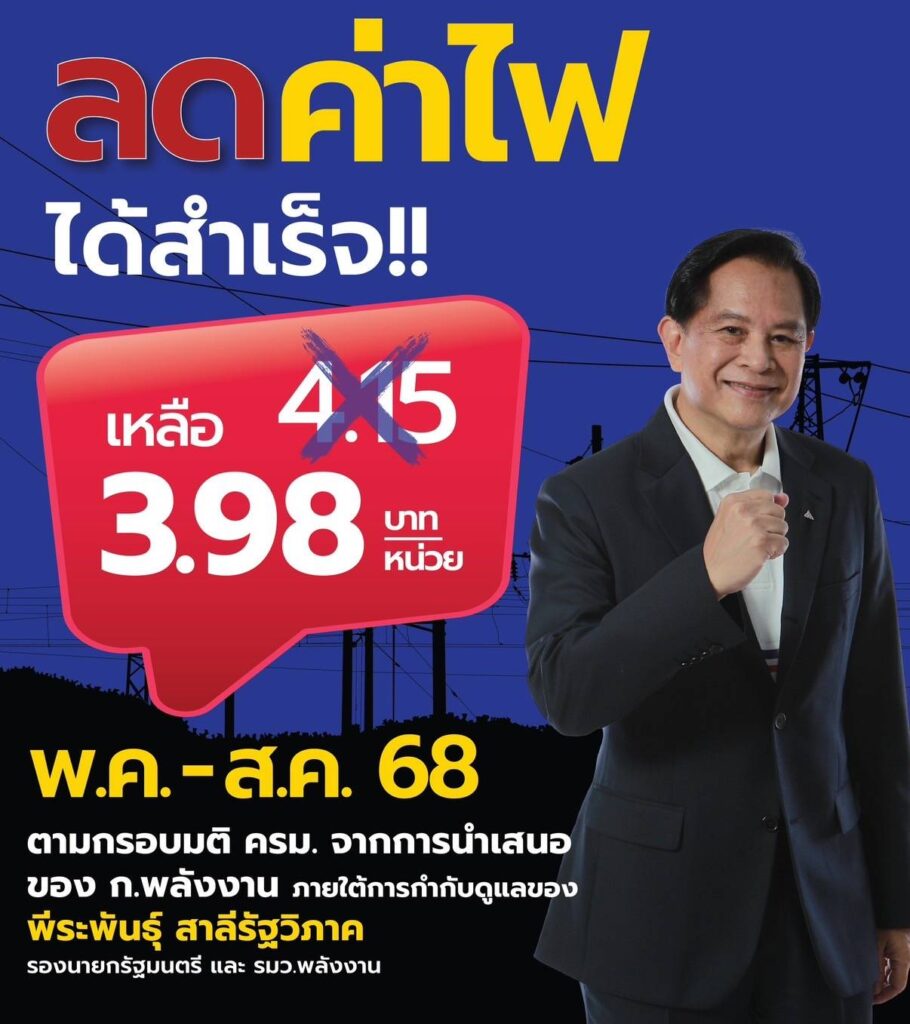 ทำเนียบรัฐบาล วันที่ 30 เม.ย. นางสาวศศิกานต์ วัฒนะจันทร์ รองโฆษกประจำสำนักนายกรัฐมนตรี แถลงถึงข่าวดีว่า รัฐบาลขอขอบคุณทุกหน่วยงานที่เกี่ยวข้องที่บูรณาการทำงานร่วมกัน ทำให้สามารถลดอัตราค่าไฟฟ้าลงได้สำเร็จ เพื่อบรรเทาภาระค่าใช้จ่ายของประชาชน ซึ่งส่งผลให้อัตราค่าไฟฟ้าในรอบเดือนพฤษภาคม – สิงหาคม 2568 ลงเหลือ 3.98 บาทต่อหน่วย ตามประกาศล่าสุดของคณะกรรมการกำกับกิจการพลังงาน (กกพ.) จากเดิม ที่มติ กกพ. ประกาศราคาค่าไฟรอบ พค – สค 68 ไว้ที่ 4.15 บาท/ หน่วย
