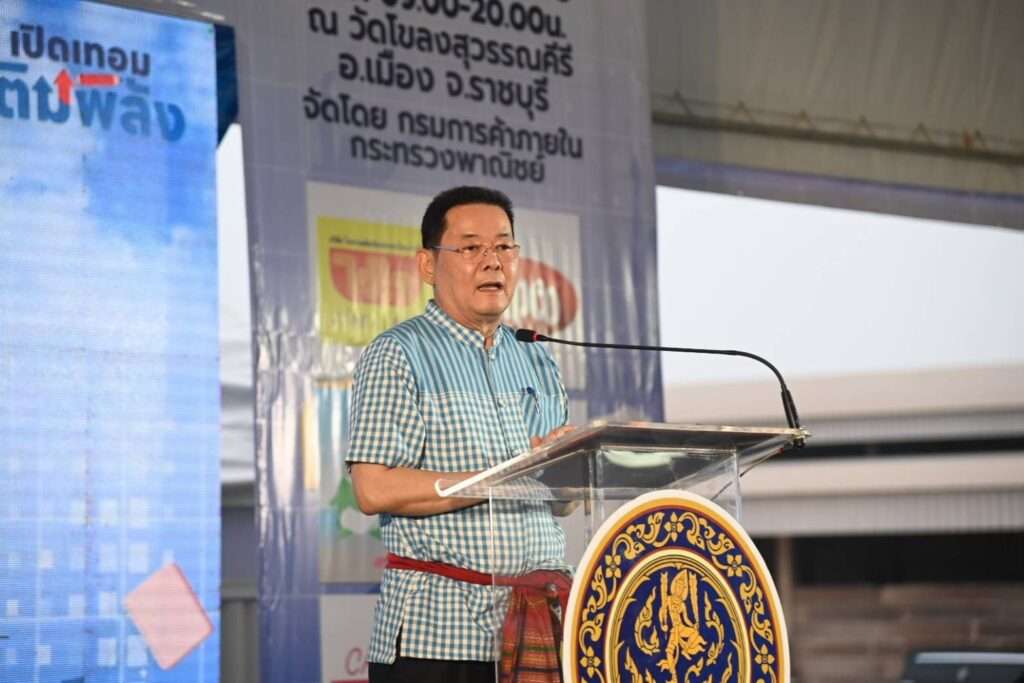 ราชบุรี – นายนภินทร ศรีสรรพางค์ รมช.พาณิชย์ เป็นประธานเปิดงานมหกรรมธงฟ้าขับเคลื่อนเศรษฐกิจภูมิภาค จังหวัดราชบุรี ภายใต้โครงการ “เปิดเทอมเติมพลัง” ซึ่งกรมการค้าภายใน กระทรวงพาณิชย์ ได้จัดงานจำหน่ายสินค้าราคาประหยัด ตามนโยบายของรัฐบาลที่ให้ความสำคัญกับการดูแลประชาชนในทุกมิติ ทั้งการลดรายจ่าย เพิ่มรายได้ ขยายโอกาส และมุ่งเน้นการกระตุ้นเศรษฐกิจ เพิ่มเม็ดเงินหมุนเวียนในระบบเศรษฐกิจของประเทศ ระหว่างวันที่ 2-4 พฤษภาคม 2568 ณ วัดโขลงสุวรรณคีรี อ.เมือง จ.ราชบุรี โดยได้รับความร่วมมือจากผู้ประกอบการ ห้างสรรพสินค้า กลุ่มเกษตรกร ผู้ผลิตรายกลางและรายย่อย (SMEs) วิสาหชุมชน นำสินค้าอุปโภคบริโภคมาจำหน่ายรวม 10 หมวด กว่า 1,000 รายการ ลดสูงสุด 60% อาทิ บะหมี่กึ่งสำเร็จรูป ปลากระป๋อง ซอสปรุงรส น้ำยาซักผ้า ของใช้ประจำวัน เครื่องครัว เครื่องใช้ไฟฟ้า เครื่องแต่งกาย สินค้าชุมชน เป็นต้น