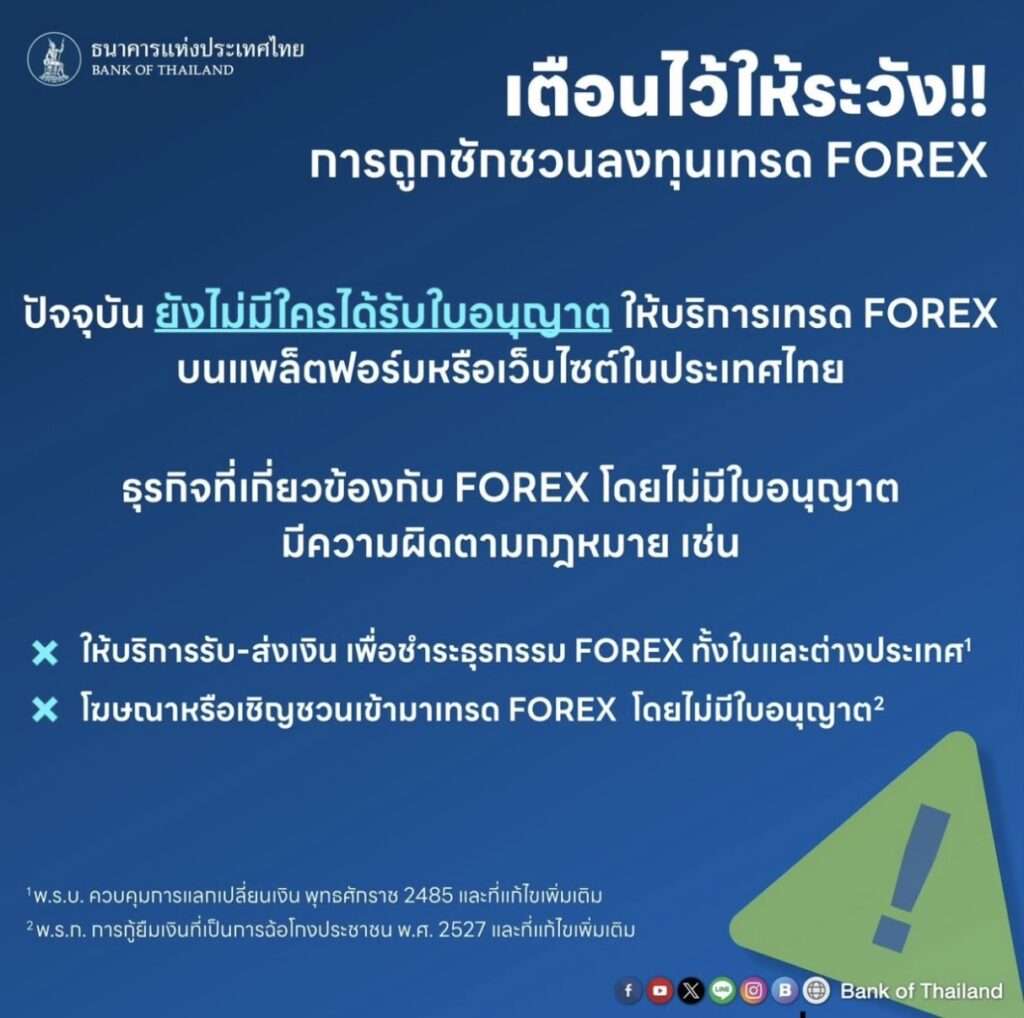 เมื่อวันที่ 9 พ.ค. ผู้สื่อข่าวไทยแทบลอยด์ รายงานว่า ธนาคารแห่งประเทศไทย ได้เตือนเตือนภัยอาชญากรรมในรูปแบบ Forex บนโลกออนไลน์ ดังนี้