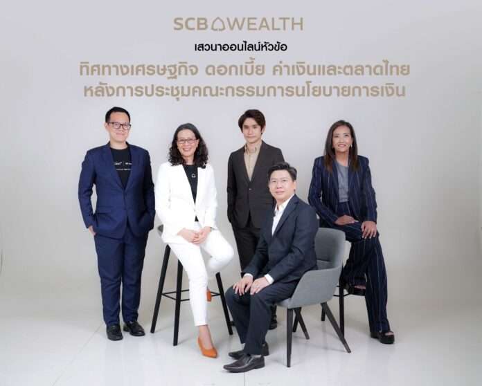 SCB WEALTH จัดงานเสวนาออนไลน์ ผ่านทาง SCB WEALTH Line official ในหัวข้อ “ทิศทางเศรษฐกิจ ดอกเบี้ย ค่าเงิน และตลาดหุ้นไทย หลังการประชุมคณะกรรมการนโยบายการเงิน”โดยการผนึกกำลังกันของหน่วยงาน SCB EIC, SCB Finance Market, SCB CIO และ บริษัทหลักทรัพย์ อินโนเวสท์ เอกซ์ ให้แก่ลูกค้า SCB WEALTH และนักลงทุนทั่วไป เพื่อวิเคราะห์ผลการประชุมคณะกรรมการนโยบายการเงิน (กนง.) ให้ลูกค้าได้รับทราบอย่างทันท่วงทีภายหลังการประกาศผลการประชุมลดอัตราดอกเบี้ยนโยบาย 0.25% มาอยู่ที่ 1.75%ต่อปี พร้อมให้คำแนะนำการลงทุนเพื่อให้ลูกค้าได้ปรับกลยุทธ์การลงทุนได้อย่างมีประสิทธิภาพ โดย SCB EIC มอง กนง. ปรับลดดอกเบี้ยสะท้อนมุมมองเศรษฐกิจเริ่มสอดคล้องภาคเอกชน คาดว่ายังมีโอกาสลดดอกเบี้ยอีก 2 ครั้งในช่วงที่เหลือของปีนี้ ด้าน SCB Finance Market ประเมินเงินบาทมีแนวโน้มอ่อนค่าในระยะสั้น และกลับมาแข็งค่าได้ในช่วงปลายปีที่ 32.50-33.50 บาทต่อดอลลาร์สหรัฐ ส่วน Moody’s ปรับลดมุมมองที่มีต่อไทย แต่ยังไม่ได้ปรับลดอันดับความน่าเชื่อถือ แม้หากถูกปรับลดในอนาคต ก็ยังอยู่ในระดับ Investment Grade ด้าน InnovestX มองตลาดหุ้นไทยปรับตัวขึ้น จากการปรับลดดอกเบี้ยนโยบายของกนง. แต่อาจเป็นเพียงระยะสั้น เนื่องจากเศรษฐกิจไทยเติบโตได้ไม่ดีเท่ากับภูมิภาค ขณะที่ กองทุนThai EGSX จะช่วยชะลอแรงขายหุ้นไทยได้ ส่วน SCB CIO เผย ธนาคารไทยพาณิชย์พร้อมสนับสนุนการขาย 4 กองทุนของบลจ.ไทยพาณิชย์ IPO 2 – 8 พ.ค. นี้ หลังจากนั้นจะเปิดขายพร้อมรับสับเปลี่ยน LTF หลังจัดตั้งกองทุนเรียบร้อยแล้ว ตั้งแต่วันที่ 13 พ.ค.- 30 มิ.ย. 2568