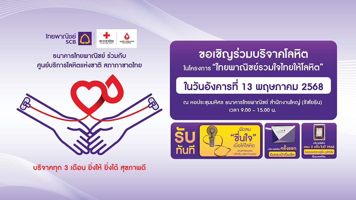 กลุ่มเอสซีบีเอกซ์ โดยธนาคารไทยพาณิชย์ ร่วมกับ ศูนย์บริการโลหิตแห่งชาติ สภากาชาดไทยขอเชิญร่วมบริจาคโลหิต ภายใต้โครงการ “ไทยพาณิชย์รวมใจไทยให้โลหิต” ในวันอังคารที่ 13พฤษภาคม 2568 เวลา 9.00-15.00 น. ณ หอประชุมมหิศร ธนาคารไทยพาณิชย์ สำนักงานใหญ่ (รัชโยธิน) เพื่อเติมเต็มและส่งต่อโลหิตที่มีคุณภาพให้มีเพียงพอต่อการรักษาพยาบาลผู้ป่วยทั่วประเทศ ยังมีผู้ป่วยจำนวนมากที่กำลังรอรับโลหิตเพื่อต่อลมหายใจ ทุก ๆ การบริจาคโลหิต 1ครั้ง สามารถนำไปช่วยชีวิตผู้ป่วยได้มากกว่า 3 ชีวิต สำหรับผู้ที่บริจาคโลหิตครั้งแรกรับทันทีกระเป๋าที่ระลึก บริจาคโลหิตครบ 2 ครั้งในปี 2568 รับพระผงหลวงปู่มั่น ภูริทตฺโต เป็นมงคลชีวิต และ 500 ท่านแรกที่ร่วมบริจาคโลหิต รับพัดลม “ชื่นใจ” แทนคำขอบคุณ