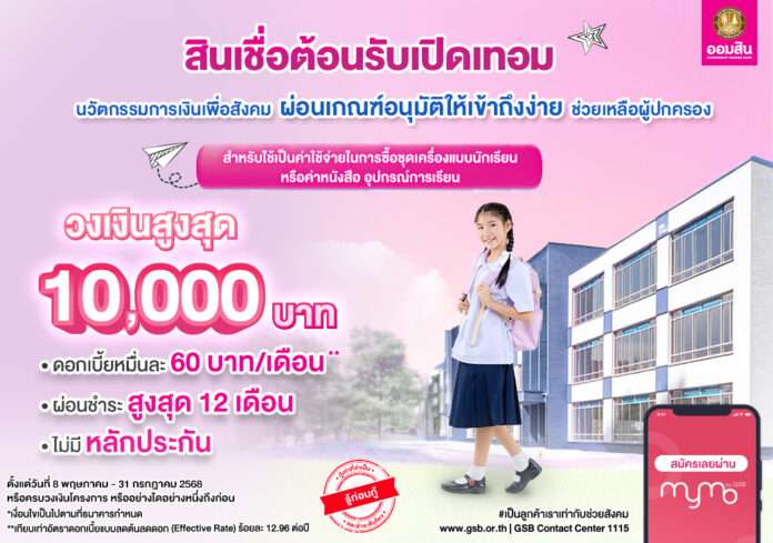 นายวิทัย รัตนากร ผู้อำนวยการธนาคารออมสิน เปิดเผยว่า ธนาคารได้ออกมาตรการ “สินเชื่อธนาคารประชาชนต้อนรับเปิดเทอม” ที่ผ่อนเกณฑ์อนุมัติให้สามารถเข้าถึงสินเชื่อได้ง่ายขึ้น และเป็นการเดินหน้าภารกิจเชิงสังคมในการสนับสนุนการเข้าถึงแหล่งเงินทุนในระบบด้วยอัตราดอกเบี้ยที่เป็นธรรม สำหรับผู้ปกครองที่มีความจำเป็นต้องใช้เงินทุนในการเตรียมความพร้อมแก่บุตรหลานในช่วงเปิดภาคเรียนใหม่ ด้วยอัตราดอกเบี้ยต่ำคงที่เพียง 0.60% ต่อเดือน วงเงินกู้ตามความจำเป็นสูงสุดไม่เกิน 10,000 บาทต่อราย ระยะเวลาผ่อนชำระไม่เกิน 1 ปี (12 งวด) ผ่อนชำระประมาณ 894 บาทต่อเดือน (รวมเงินต้นและดอกเบี้ย) ทั้งนี้ สำหรับผู้มีอาชีพ รายได้ และที่อยู่อาศัยแน่นอน สามารถยื่นขอสินเชื่อโดยไม่ต้องมีหลักประกัน ผ่านแอปพลิเคชัน MyMo หรือติดต่อธนาคารออมสินสาขาเพื่อขอคำแนะนำในการสมัครสินเชื่อ ได้ตั้งแต่วันที่ 8 พฤษภาคม – 31 กรกฎาคม 2568