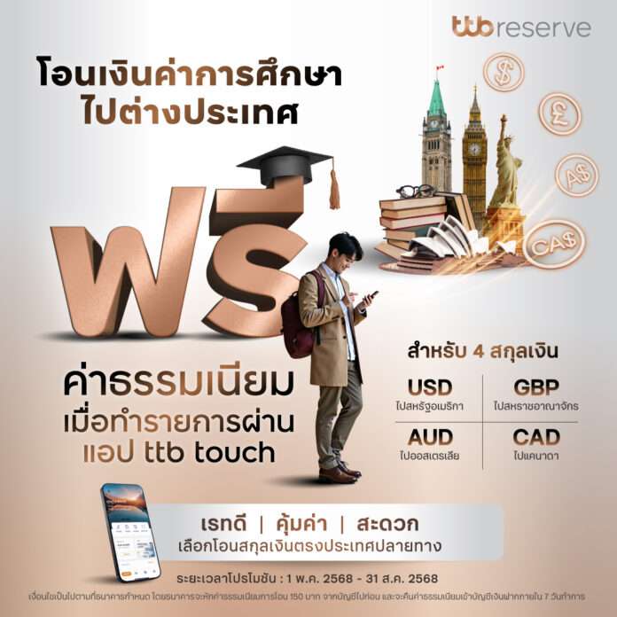 ทีเอ็มบีธนชาต หรือ ทีทีบี พร้อมนำเสนอโซลูชันทางการเงินเพื่อตอบโจทย์ความต้องการของลูกค้าคนสำคัญ สนับสนุนการศึกษาระดับนานาชาติของลูกค้าที่ส่งบุตรหลานศึกษาต่อในต่างประเทศด้วยแคมเปญพิเศษ “ฟรีค่าธรรมเนียมโอนเงินค่าการศึกษาไปต่างประเทศ” สำหรับ 4 สกุลเงินหลัก ได้แก่ USD, GBP, AUD และ CAD ผ่านทางแอป ttb touch ตั้งแต่วันที่ 1 พฤษภาคม – 31 สิงหาคม 2568