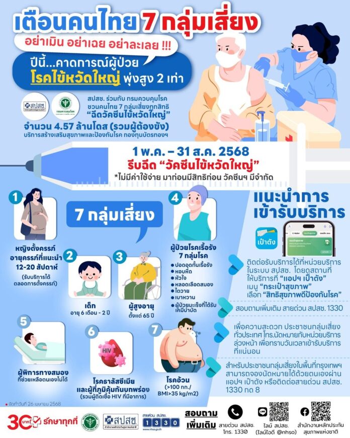 สปสช.ชวนคนไทย 7 กลุ่มเสี่ยง ฉีดวัคซีนไข้หวัดใหญ่ ฟรี! ตั้งแต่วันนี้ – 31 ส.ค. 68