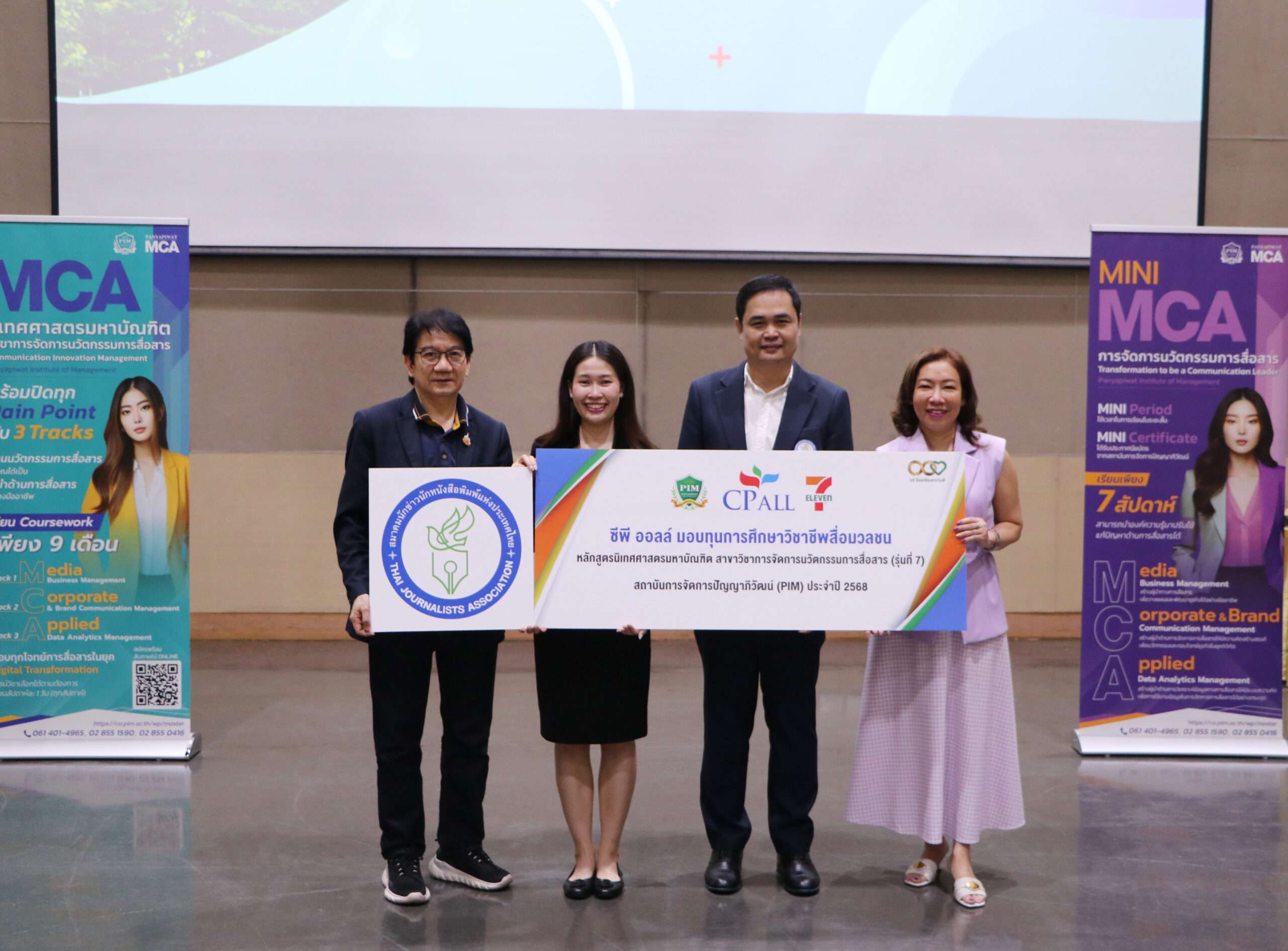 นายธานี ลิมปนารมณ์ ผู้ช่วยกรรมการผู้จัดการ บริษัท ซีพี ออลล์ จำกัด (มหาชน) ผู้บริหารเซเว่น อีเลฟเว่น และเซเว่น เดลิเวอรี่ พร้อมด้วย รศ.ดร.จินตวีร์ เกษมศุข คณบดี คณะนิเทศศาสตร์ สถาบันการจัดการปัญญาภิวัฒน์ (พีไอเอ็ม) และคณะผู้บริหาร ร่วมแสดงความยินดี และเป็นผู้แทนในการมอบทุนการศึกษาวิชาชีพสื่อมวลชนให้กับสมาคมนักข่าวนักหนังสือพิมพ์แห่งประเทศไทย โดยมีนายชำนาญ ไชยศร อุปนายกฝ่ายกิจกรรมพิเศษและพัฒนาส่งเสริมศักยภาพสื่อมวลชน สมาคมฯ เป็นผู้แทนรับมอบ ซึ่งในปีนี้สมาชิกสมาคมฯ ที่ได้รับทุนการศึกษาหลักสูตรนิเทศศาสตร์มหาบัณฑิต สาขาวิชาจัดการนวัตกรรมการสื่อสาร ซึ่งเป็นทุนการศึกษาที่ซีพี ออลล์ สนับสนุนให้กับสื่อมวลชนมาอย่างต่อเนื่อง โดยมีวัตถุประสงค์เพื่อพัฒนาศักยภาพสื่อมวลชนให้ปฏิบัติหน้าที่เพื่อประโยชน์สาธารณะ ได้แก่ นางสาวพรทิวา กันธิยาใจ จากสถานีโทรทัศน์แห่งประเทศไทย (NBT)