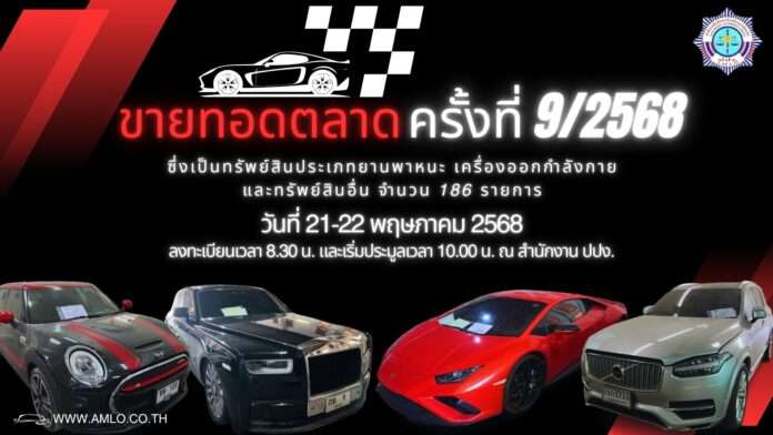 สำนักงาน ปปง. จะทำการขายทอดตลาดทรัพย์สินโดยวิธีการประมูลปากเปล่า ครั้งที่ 9/2568 ซึ่งเป็นทรัพย์สินประเภทยานพาหนะ อุปกรณ์ออกกำลังกาย และทรัพย์อื่น จำนวน 186 รายการ โดยจะ ทำการขายทอดตลาดทรัพย์สิน ลำดับที่ 1-55 ในวันที่ 21 พฤษภาคม 2568 และลำดับที่ 56-186 ในที่ 22 พฤษภาคม 2568 ลงทะเบียนตั้งแต่เวลา 08.30 น.เริ่มประมูลเวลา 10.00 น. เป็นต้นไป ณ ห้องประชุม 101 ชั้น 1 อาคารสำนักงาน ปปง. โดยมีรายการทรัพย์สินที่น่าสนใจ ดังนี้