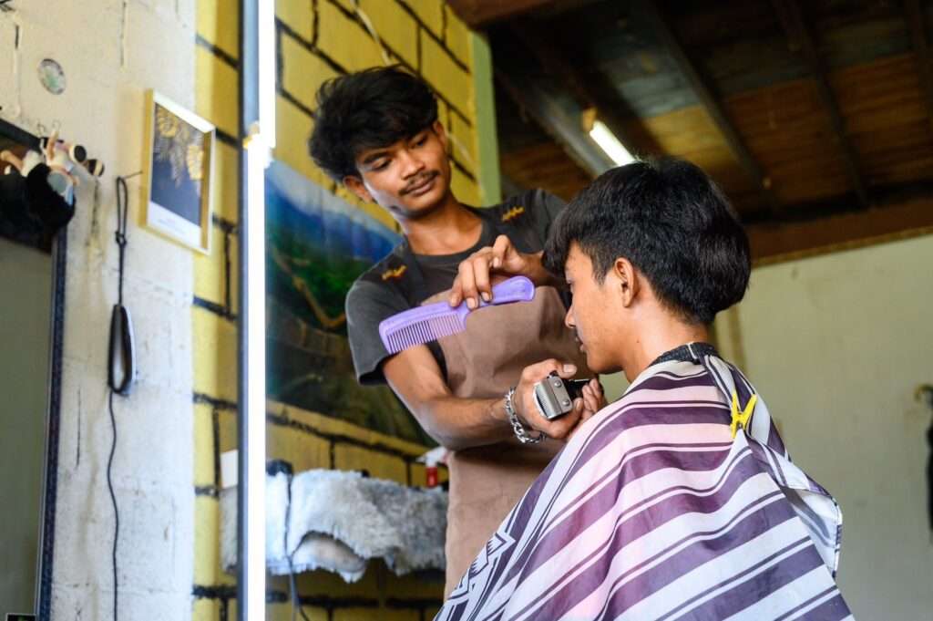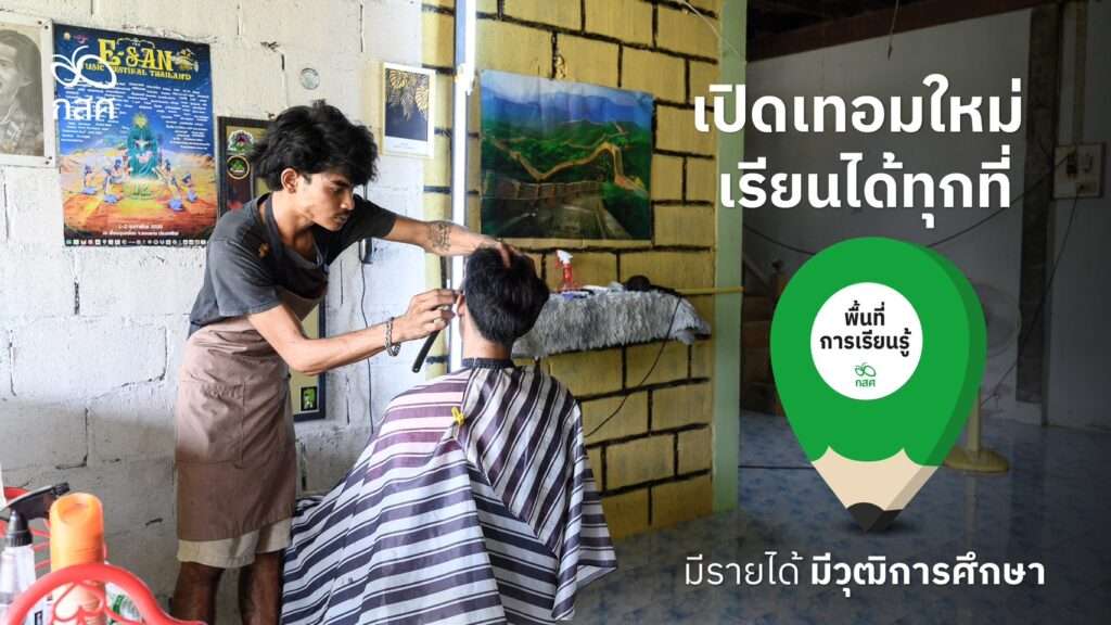 นายคติกร ทองนรินทร์ หรือ “เนส” นักเรียนโรงเรียนเคลื่อนที่ Mobile school ศูนย์การเรียนซีวายเอฟ อบต.หนองสนิท จ.สุรินทร์ เครือข่ายการศึกษายืดหยุ่น กสศ. เล่าว่า งานหลักของผมคือ เป็นช่างตัดผม การเรียนแต่ละครั้ง จะมีการตั้งหัวข้อ ตั้งโจทย์การเรียนรู้ที่เชื่อมโยงกับ 8 กลุ่มสาระวิชาหลักของ สพฐ. เพื่อให้สามารถนำไปวัดประเมินผลลัพธ์ เช่น วิชาคณิตศาสตร์ ก็จะมีการตั้งโจทย์ ให้ผมลองทำบัญชี รายรับรายจ่าย ของร้านตัดผม คำนวณต้นทุน ที่เกิดขึ้นในระหว่างการเปิดร้าน วิชาศิลปะ ก็จะให้โจทย์เรื่องการออกแบบทรงผม ตามความต้องการของลูกค้า